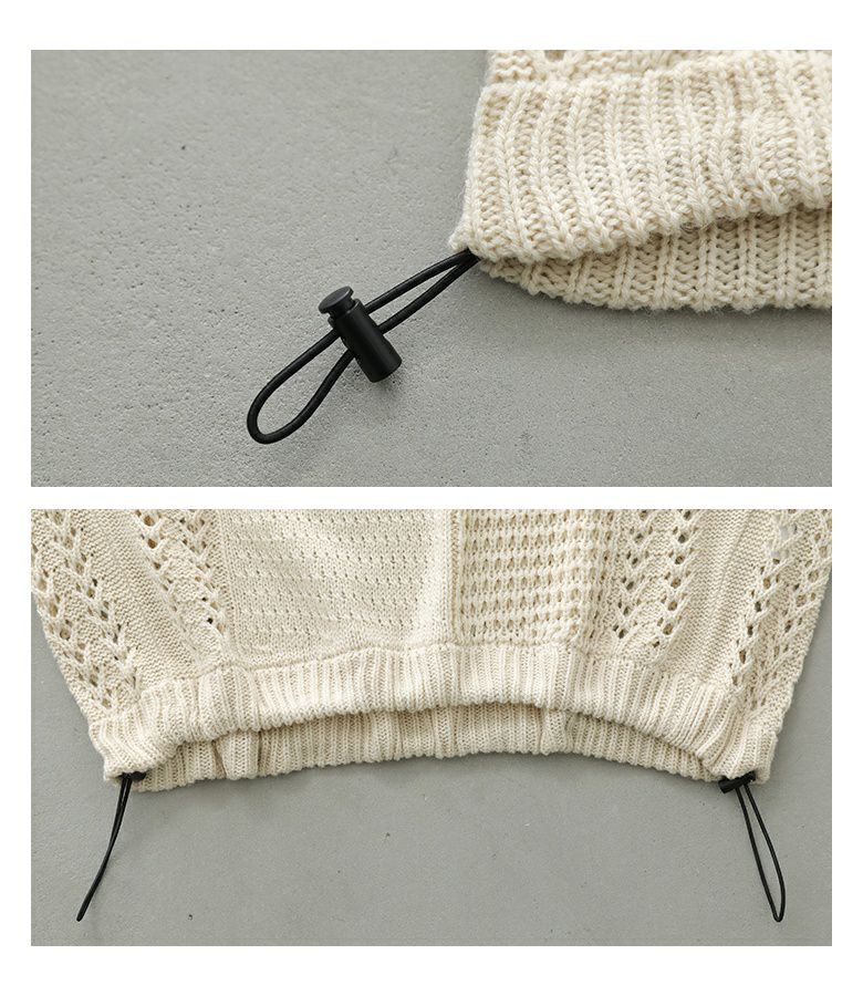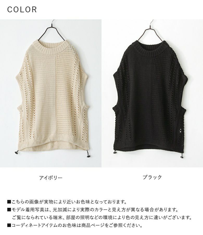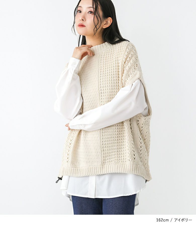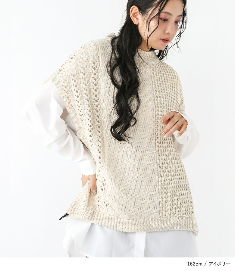 編地切り替えデザインのニットベスト。裾にはドロストがついているのでお好みのシルエットに調節可能です。ワンピースからカットソー、シャツなどいつものコーデにプラスするだけでお洒落度が上がるアイテム。
