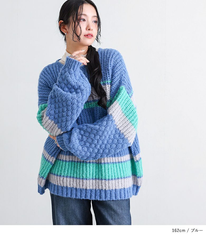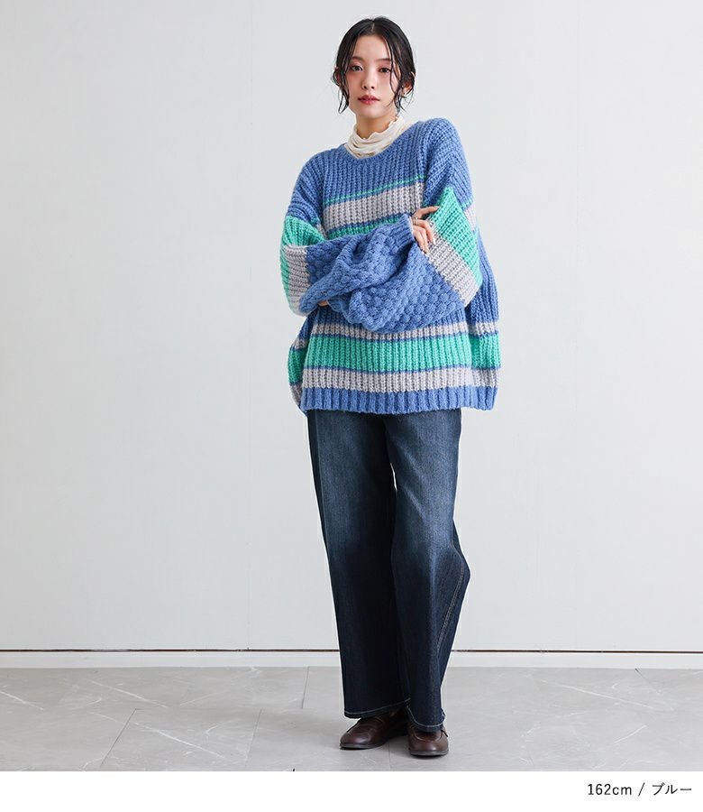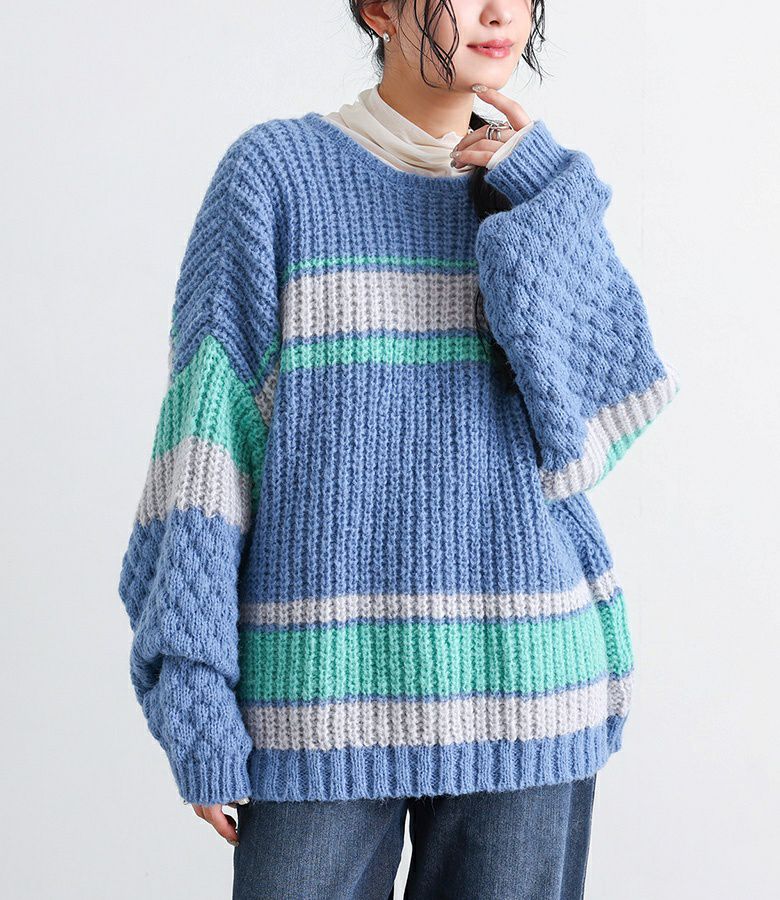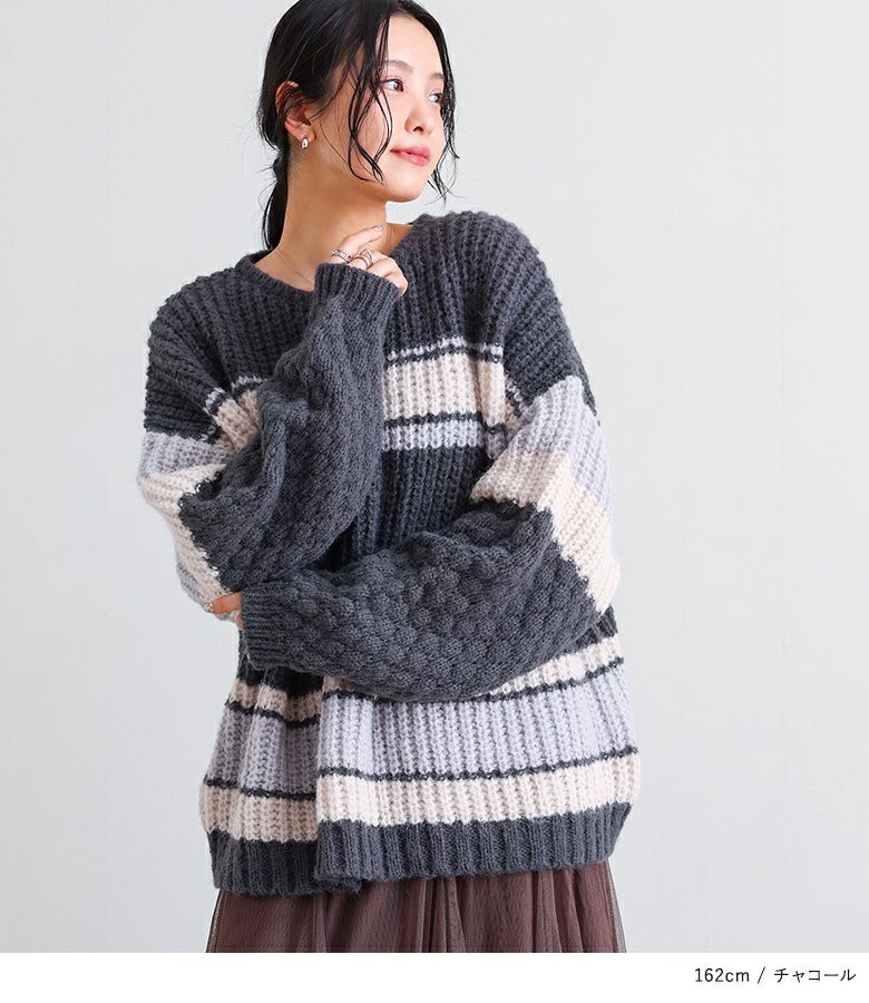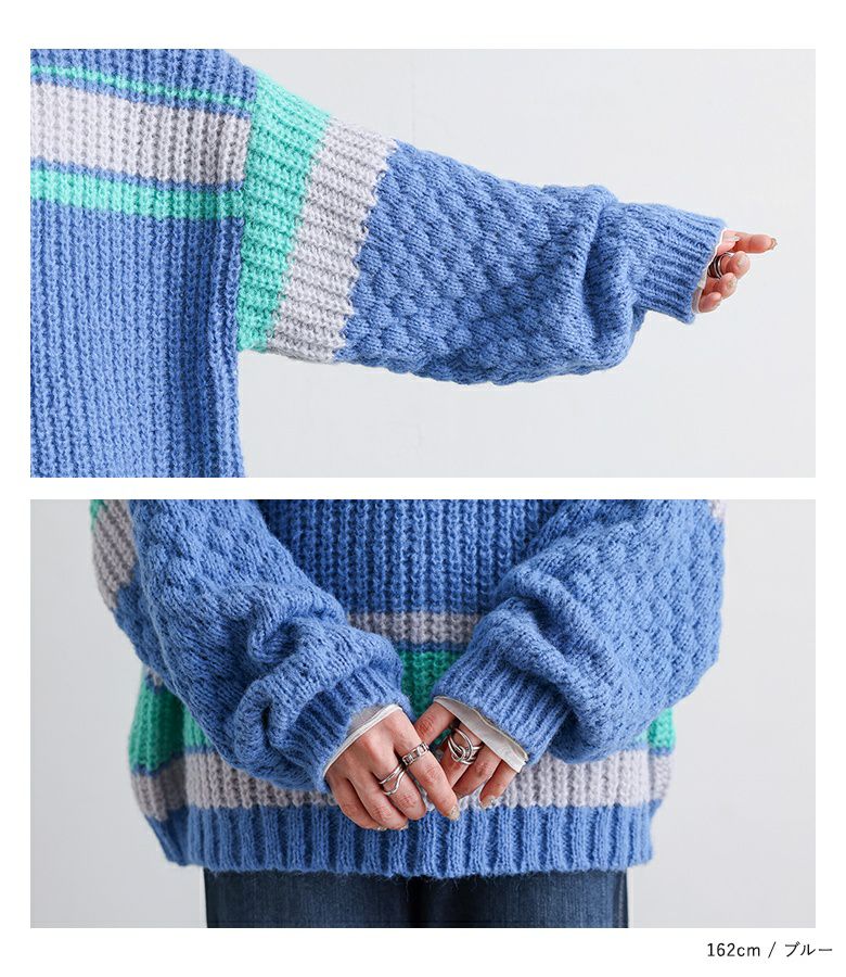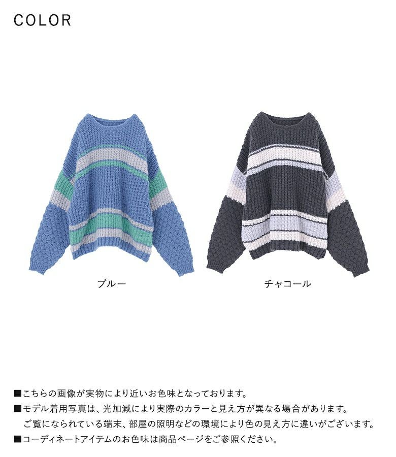 配色が目を惹くマルチボーダー柄のローゲージニットトップス。ざっくりとした編み地に、袖部分だけ異なる編地を使用し、ポコポコとした立体感でおしゃれなアクセントをプラスしています。ボリュームのある袖シルエットが程よい抜け感を演出し、シンプルな形ながらもこなれた印象に。大人も着やすいすっきりとした首周りのデザインです。