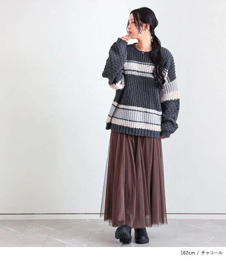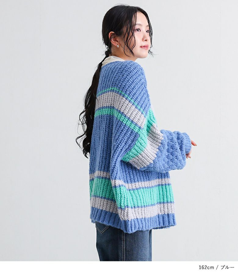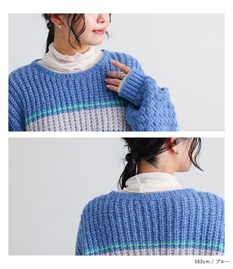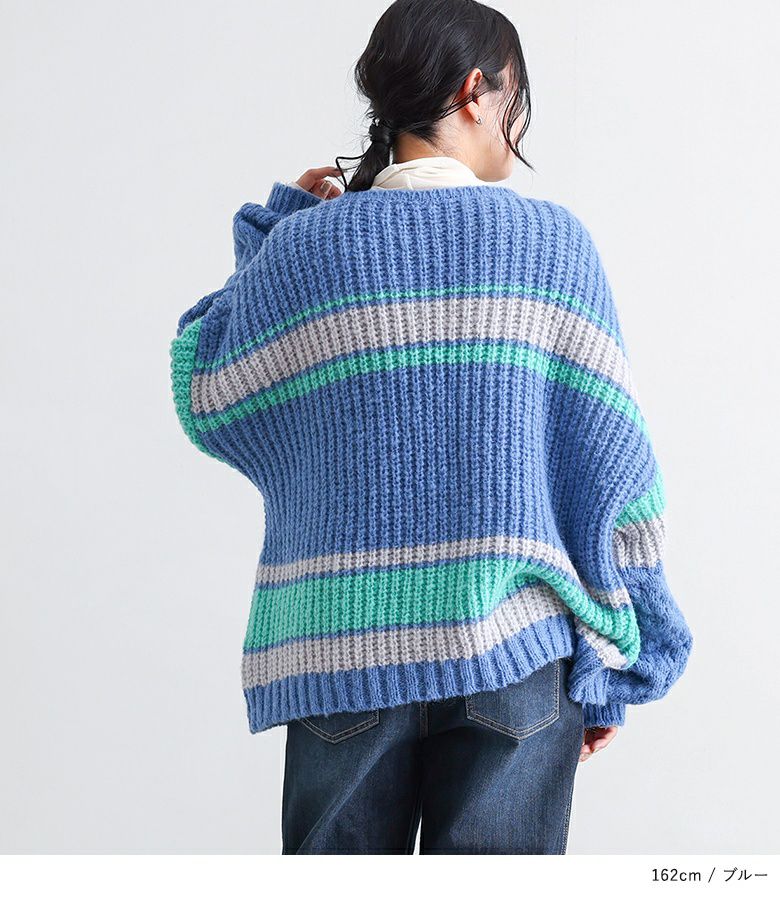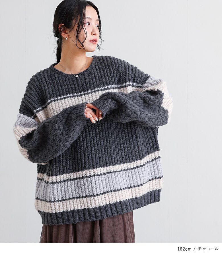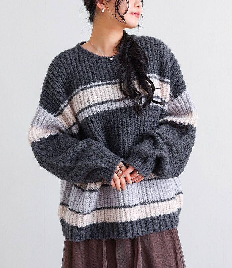 配色が目を惹くマルチボーダー柄のローゲージニットトップス。ざっくりとした編み地に、袖部分だけ異なる編地を使用し、ポコポコとした立体感でおしゃれなアクセントをプラスしています。ボリュームのある袖シルエットが程よい抜け感を演出し、シンプルな形ながらもこなれた印象に。大人も着やすいすっきりとした首周りのデザインです。