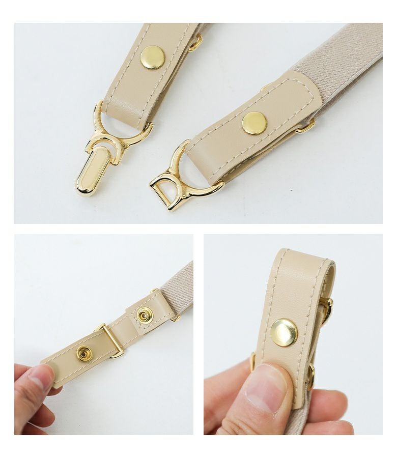 金具と帯を繋ぐ付属部分には程良いシボ感でニュアンス感じる合皮皮革を使用。帯部分はゴム製の素材を使用し、伸縮性があるためラクな付け心地が叶います。