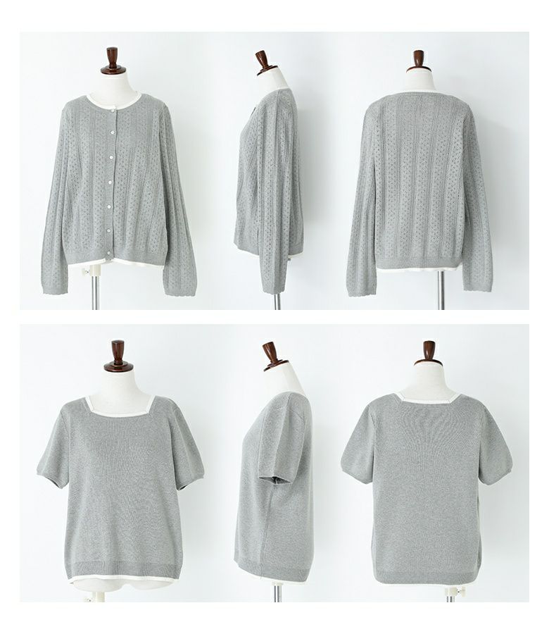 【2】 袖丈(長袖カーディガン):指先が少し見える位 袖丈(半袖ニット):ひじ上7cm位 着丈:ヒップ上5cm位 腕周り:ややゆったり バスト:ややゆったり 全体:ややゆったり