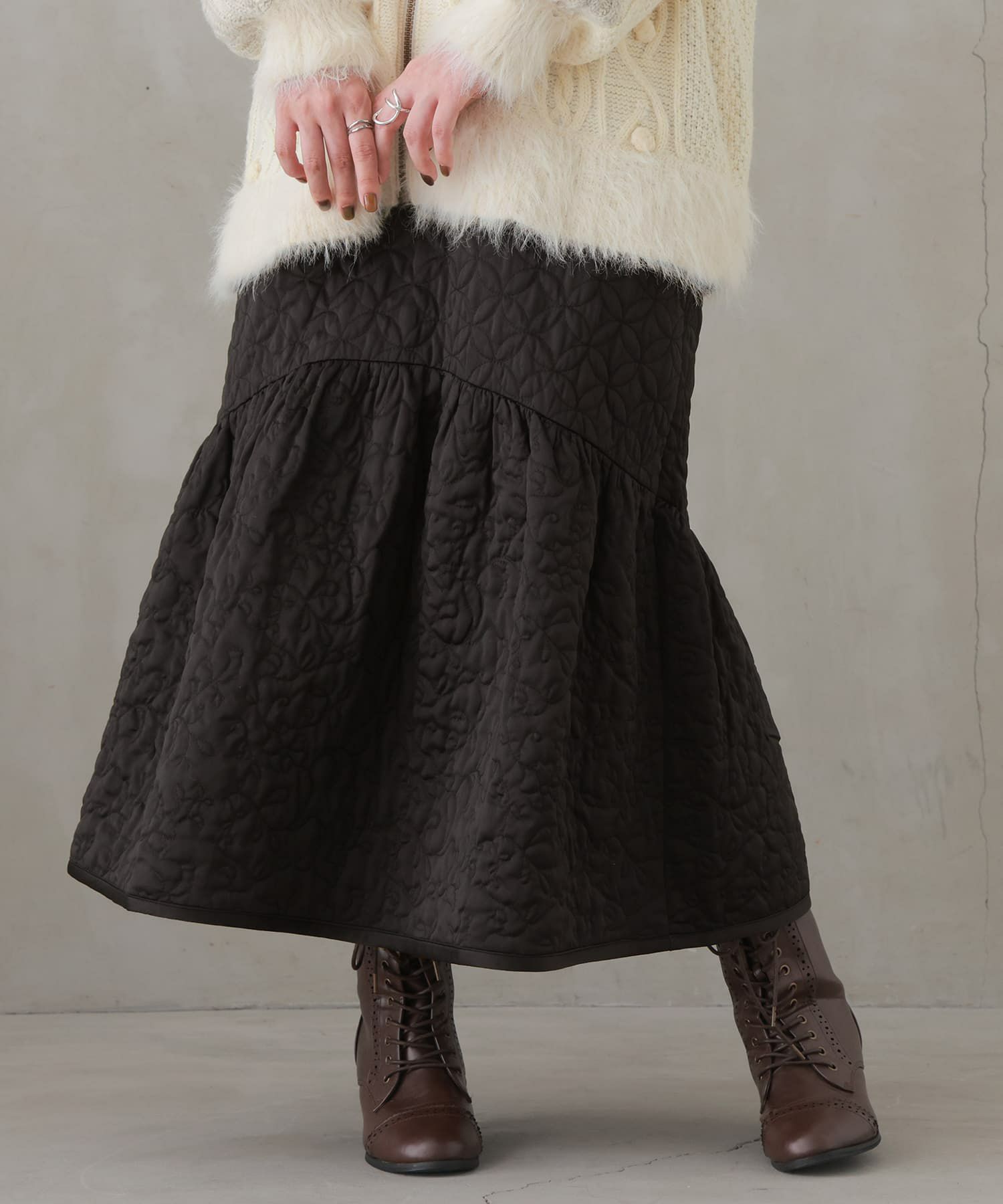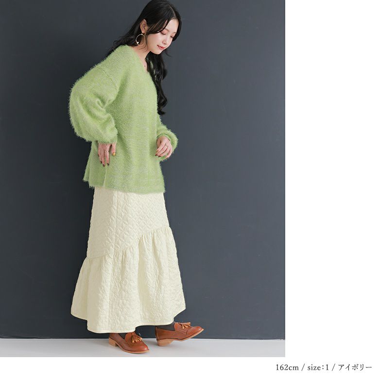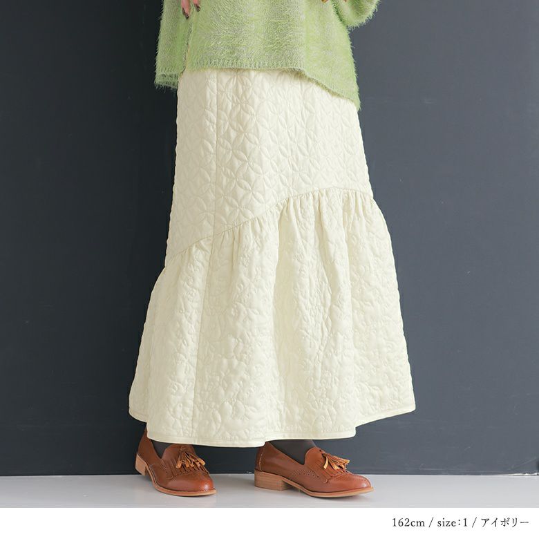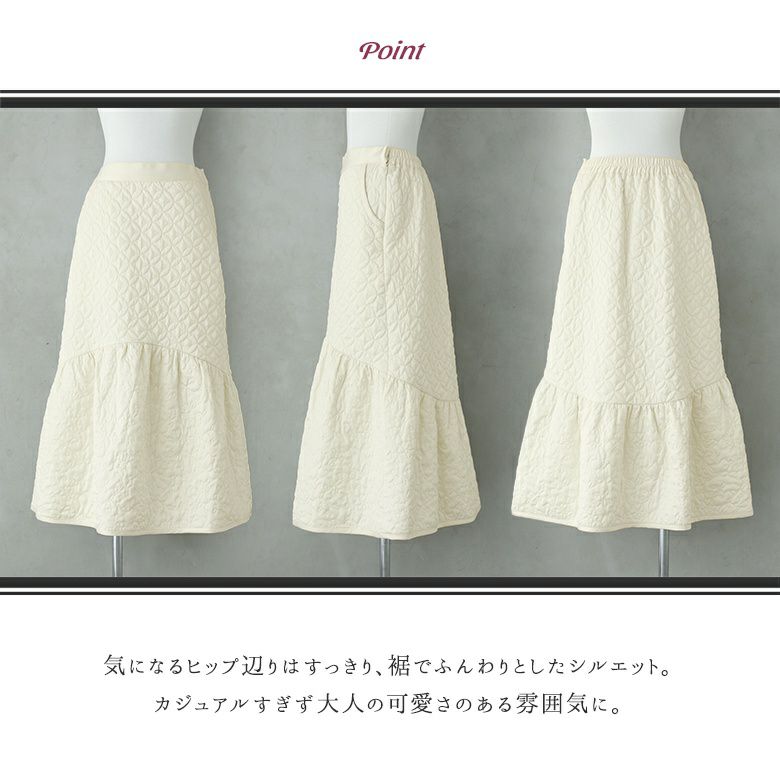 花柄×タイル風の幾何学柄キルティングをデザインした他にはないロングスカート。気になるヒップ周りはすっきり、裾はふんわりとしたマーメイド風シルエットがカジュアルすぎず大人の可愛さある雰囲気に。