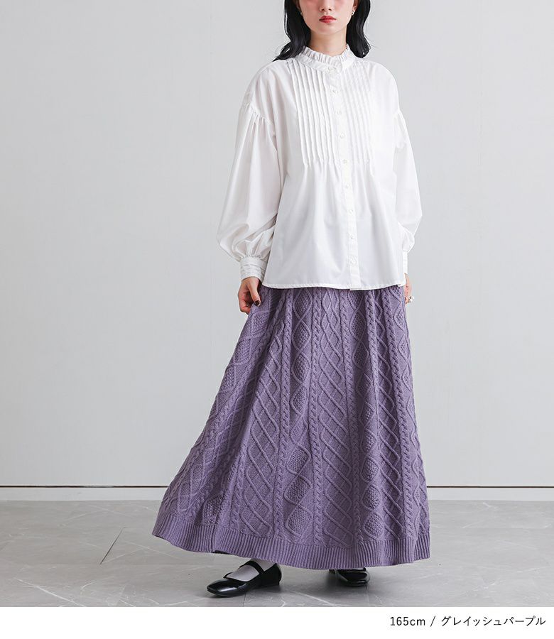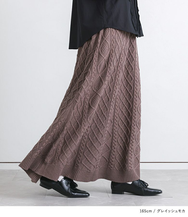 暖かみのあるケーブル編みが印象的なニットスカート。Aラインシルエットですっきりとご着用いただけます。ウエストはゴムシャーリングでストレスフリーな穿き心地を叶え、両サイドにはポケットもついて機能性もある一枚です。