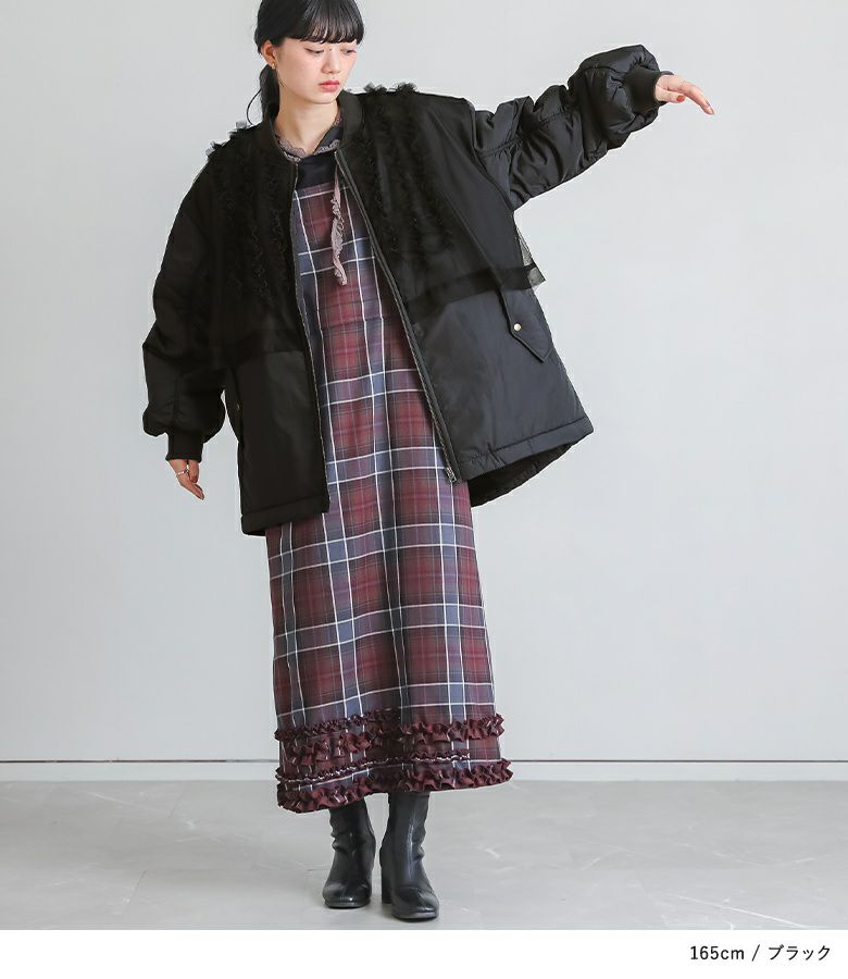 チュールをレイヤードしたMA-1風のミドルブルゾン。レイヤードしたチュールにはフリルをたたきつけて甘さもプラスし印象的なデザインです。前後差のある着丈とAラインのシルエットで抜け感のある大人印象に。中綿がしっかり入っているので軽くて暖かい優秀アウターです。