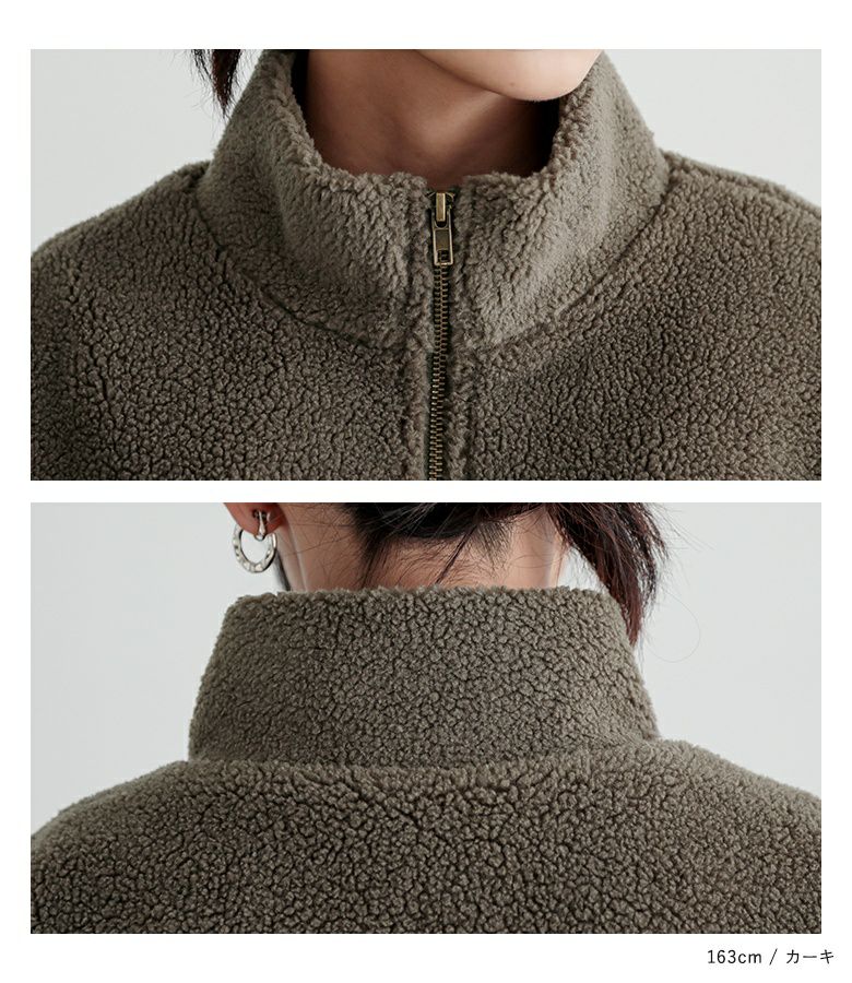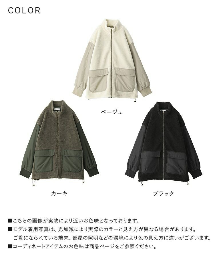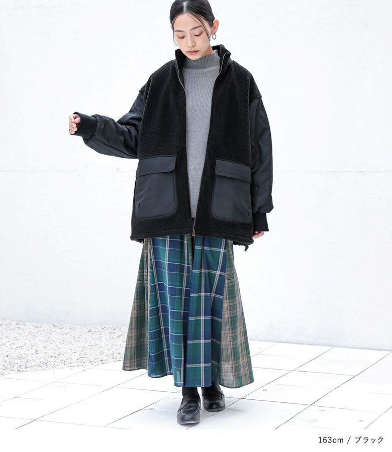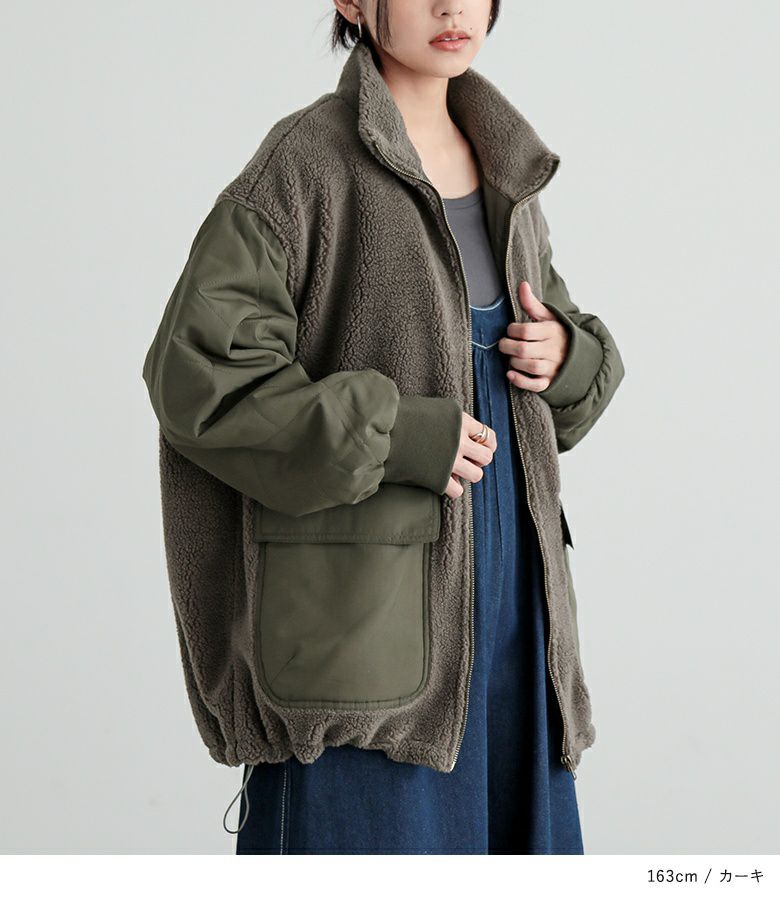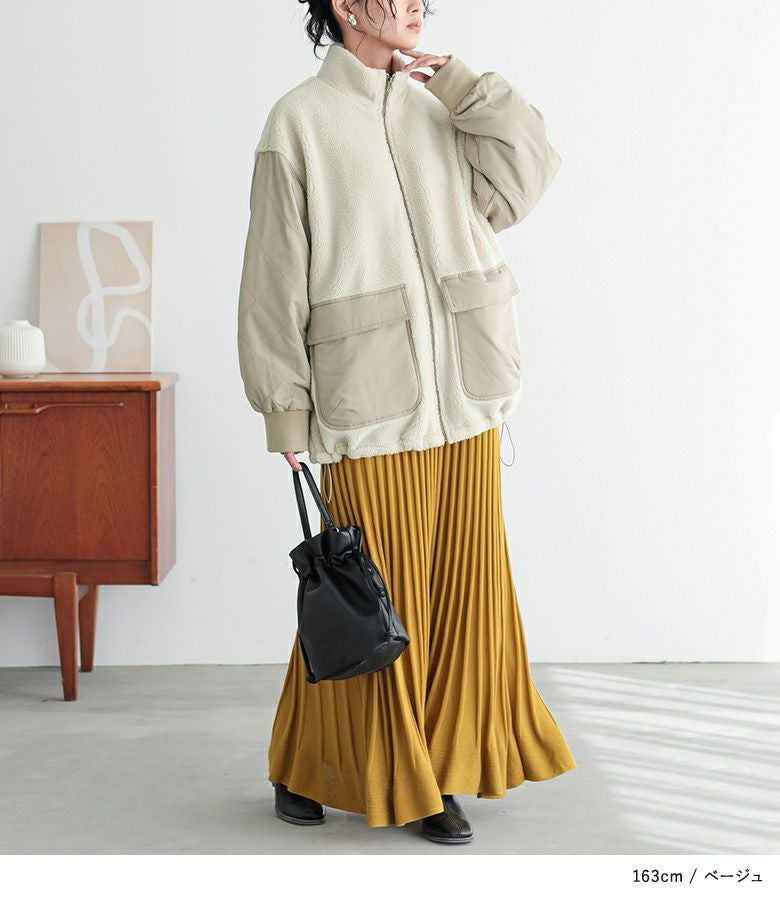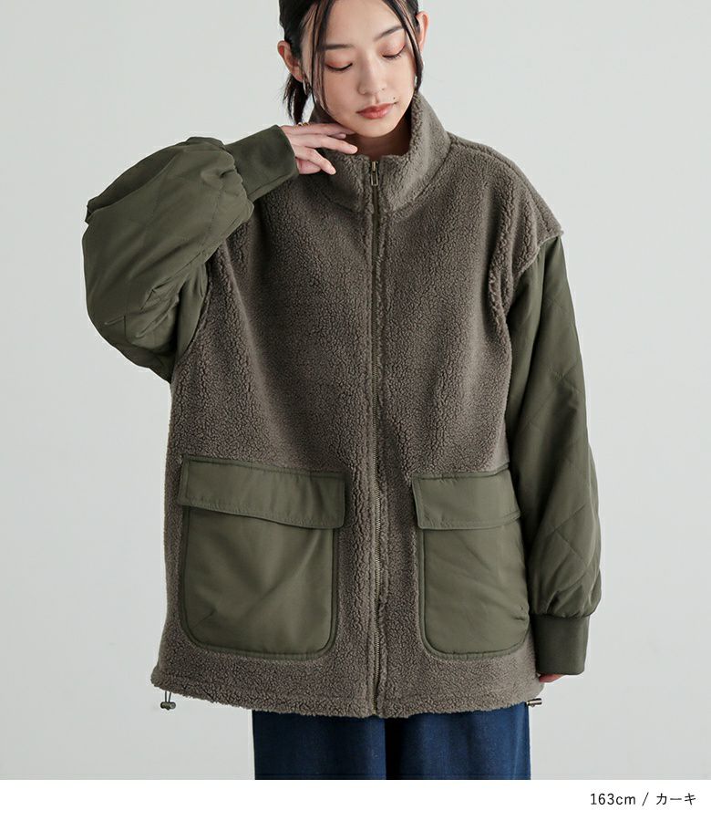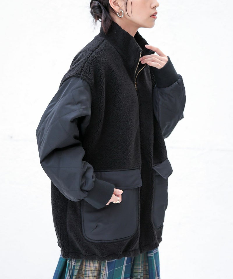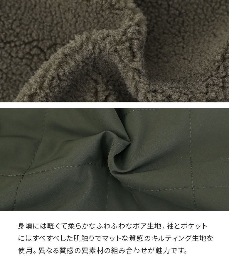 軽くて柔らかなボア×ダイヤ柄キルティング生地をドッキングした異素材ブルゾン。