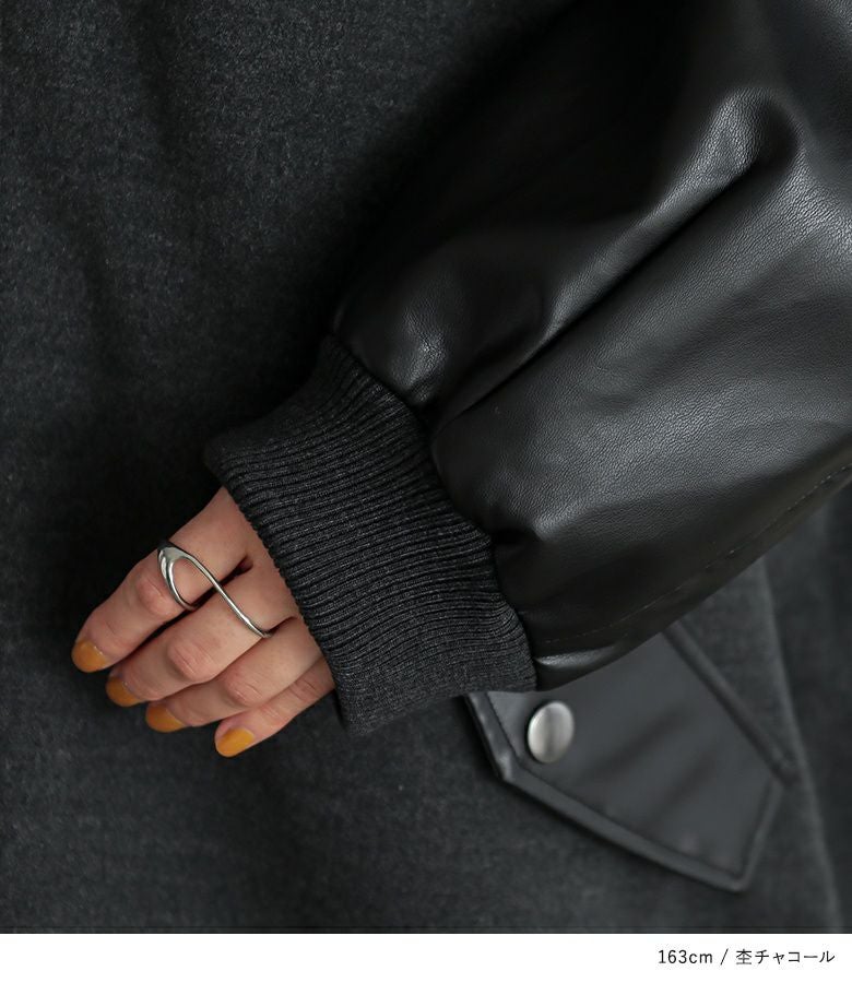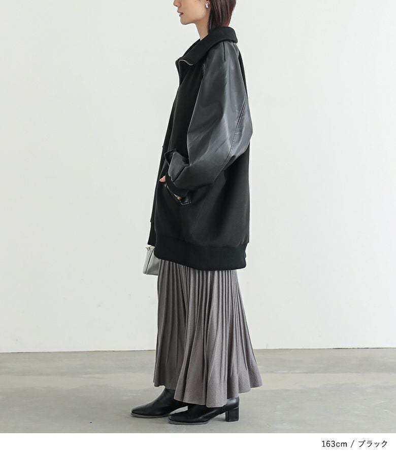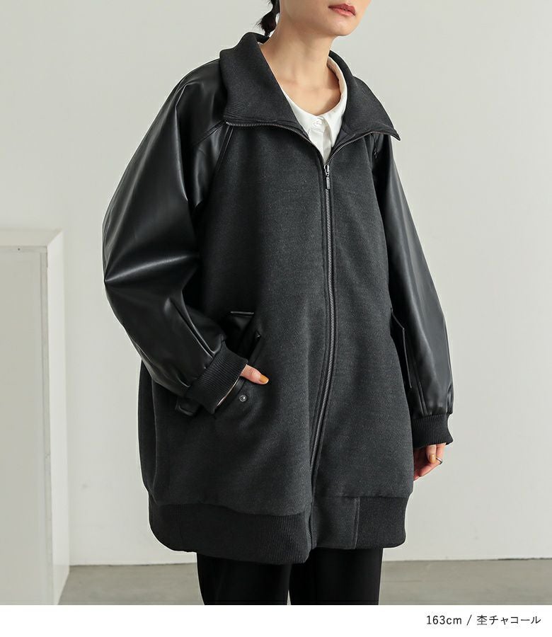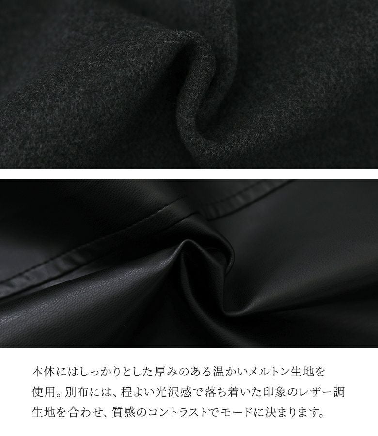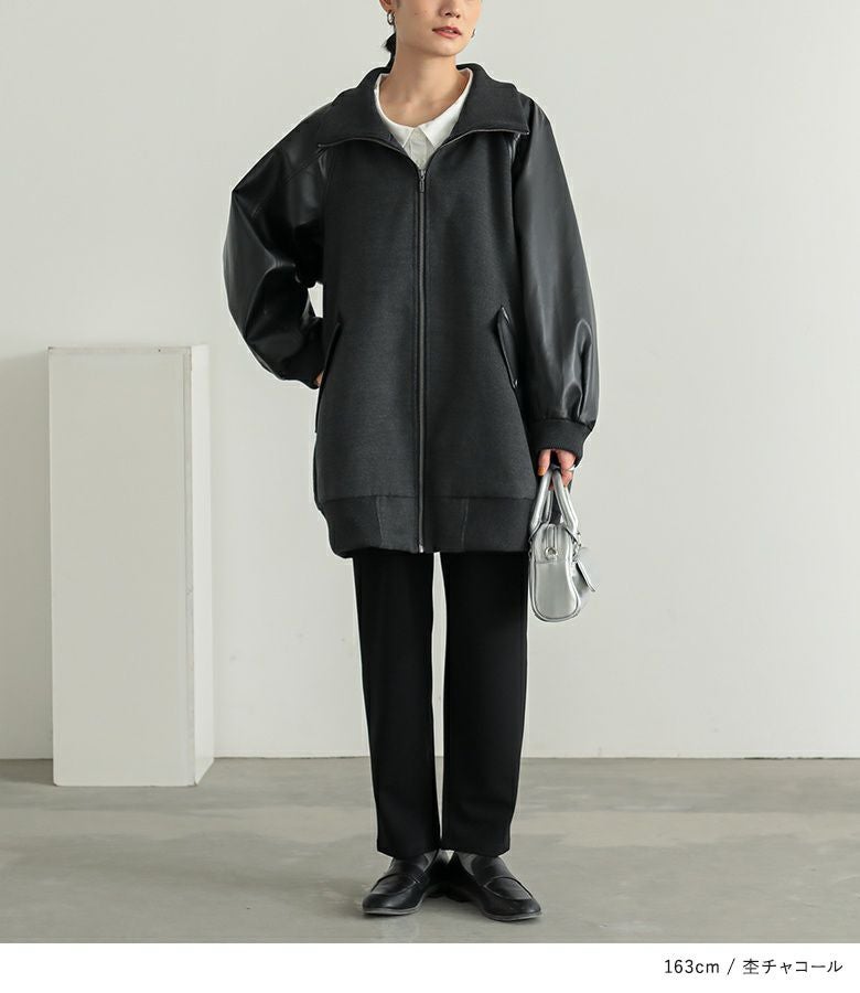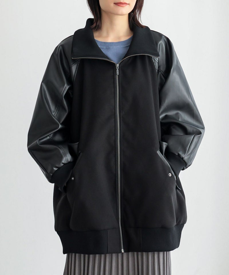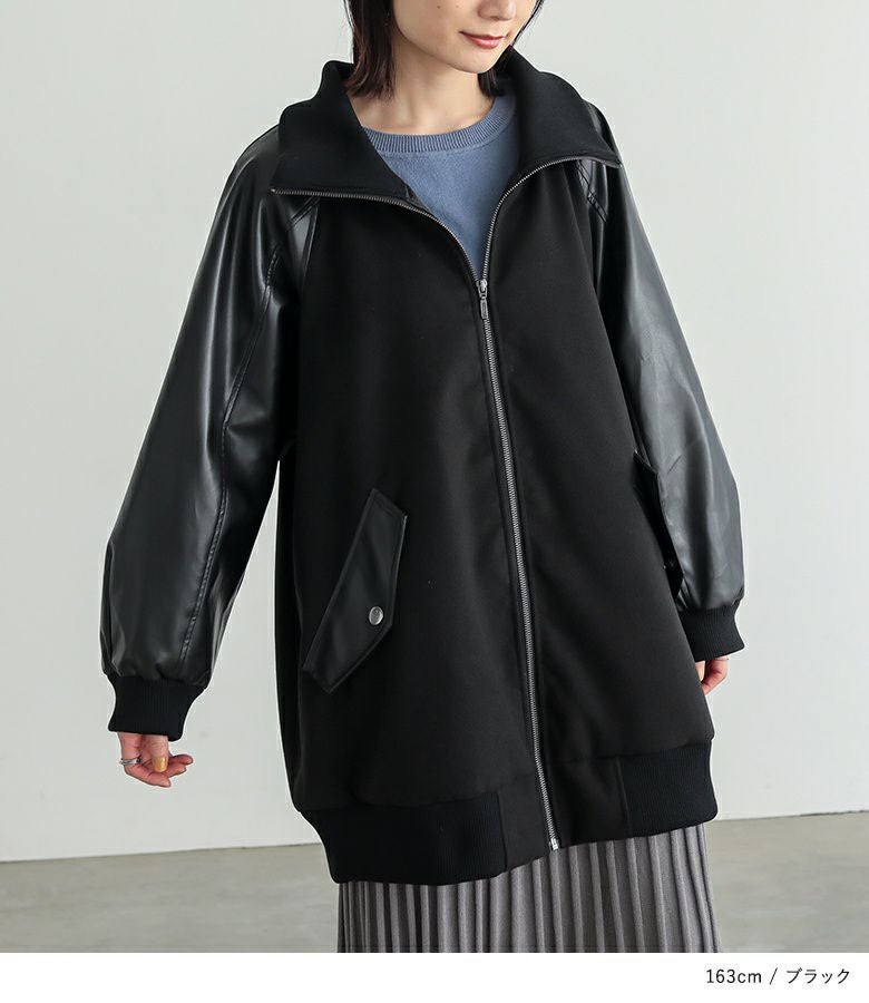 メルトン生地×レザー調生地を切替えたロング丈の異素材切替ブルゾン。