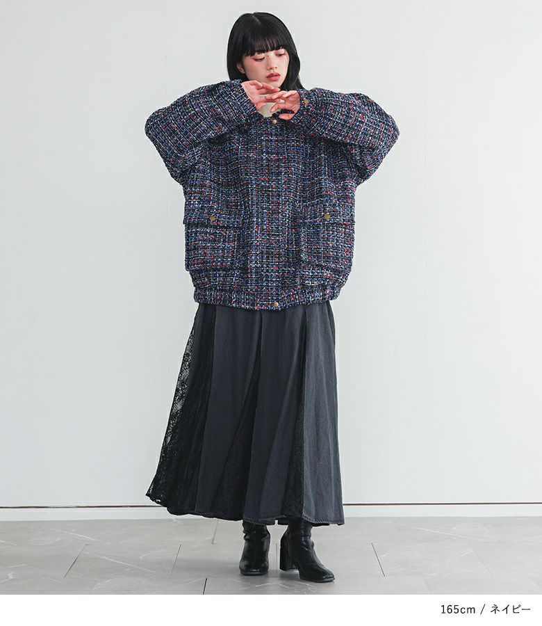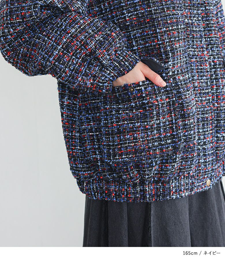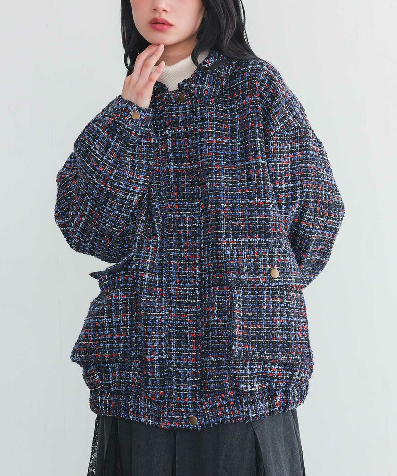 ファンシーツイードを使ったブルゾン。華やかなツイード生地を襟付きのブルゾンで普段使いしやすくカジュアルダウンさせたデザインです。裾にはゴムが入っているからゆるっとしたシルエットが女性らしさを漂わせます。立体的なポケットやドットボタンでアクセントを入れた細部までこだわった一着。