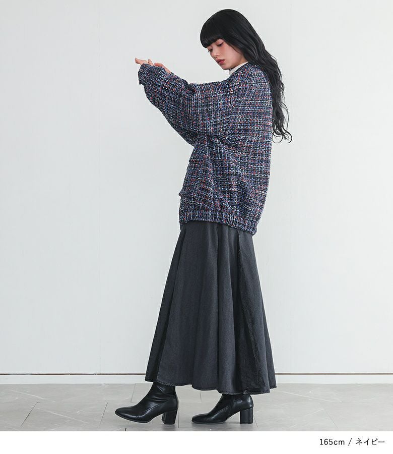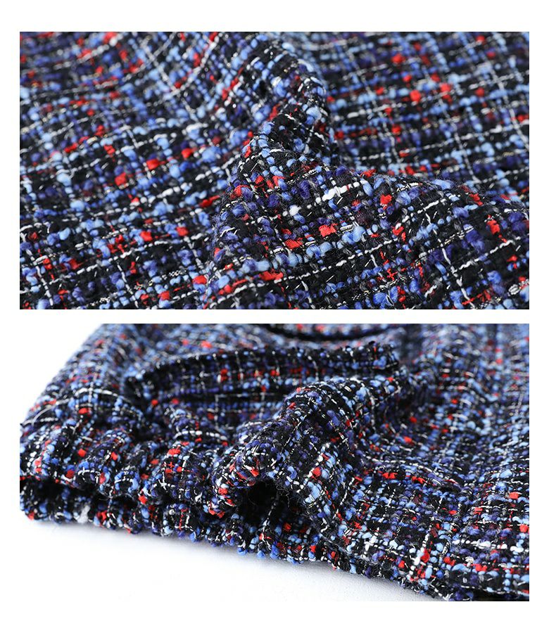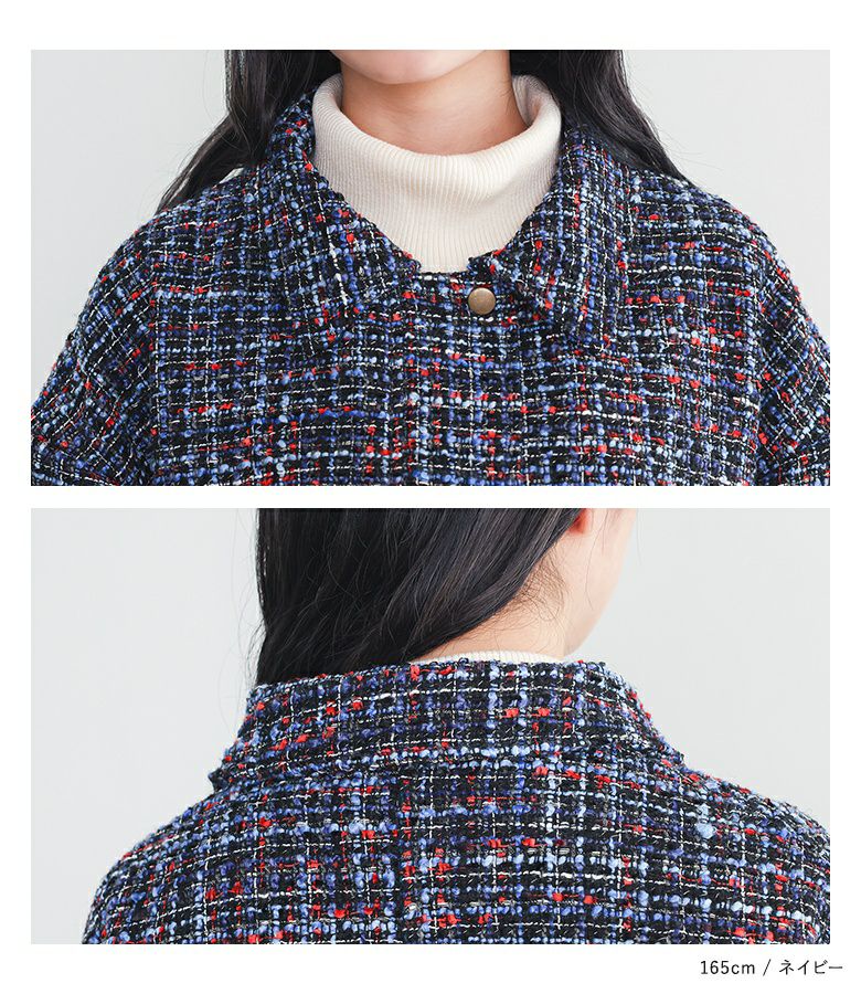 多色使いのファンシーツイード生地を使用。赤や青、ラメ糸などをミックスした華やかな生地です。裏地にはさらっとした肌触りのポリエステル生地を使用し、快適にご着用いただけます。