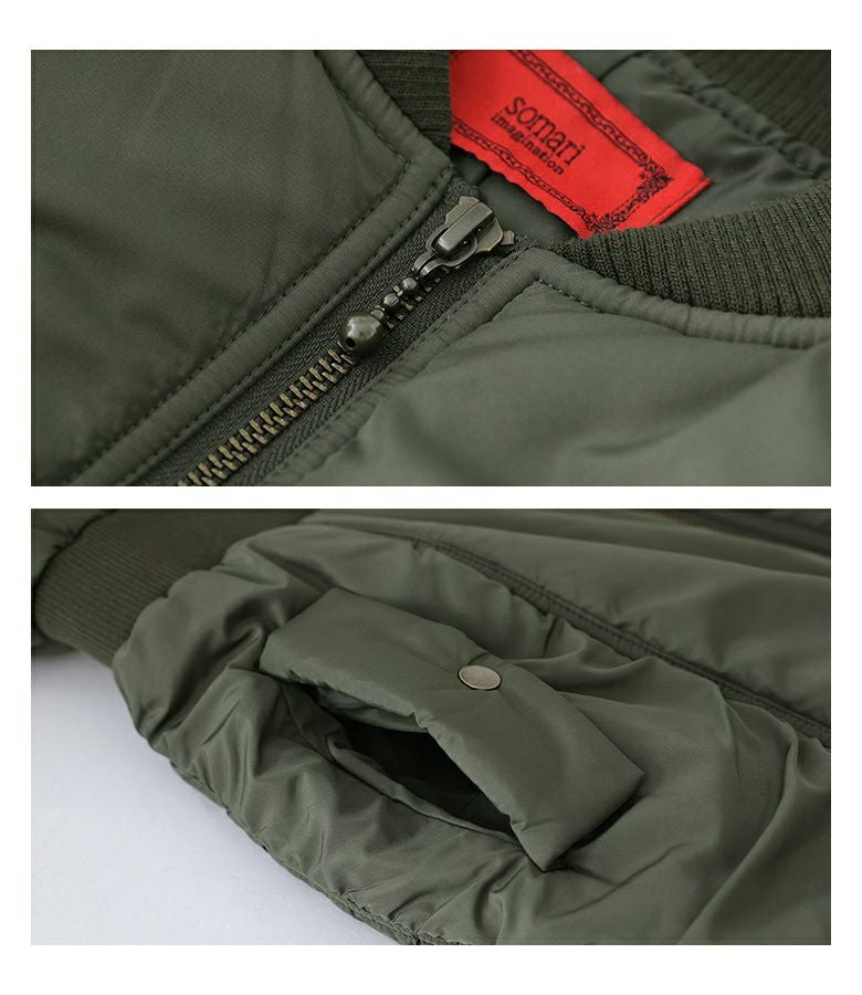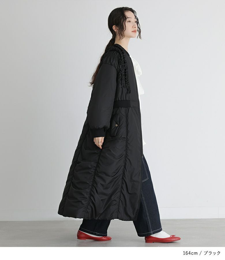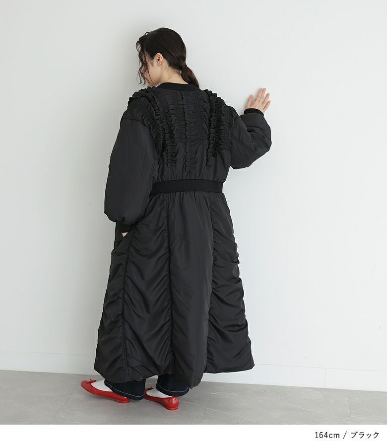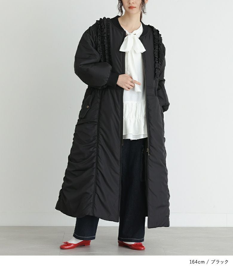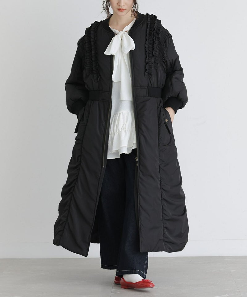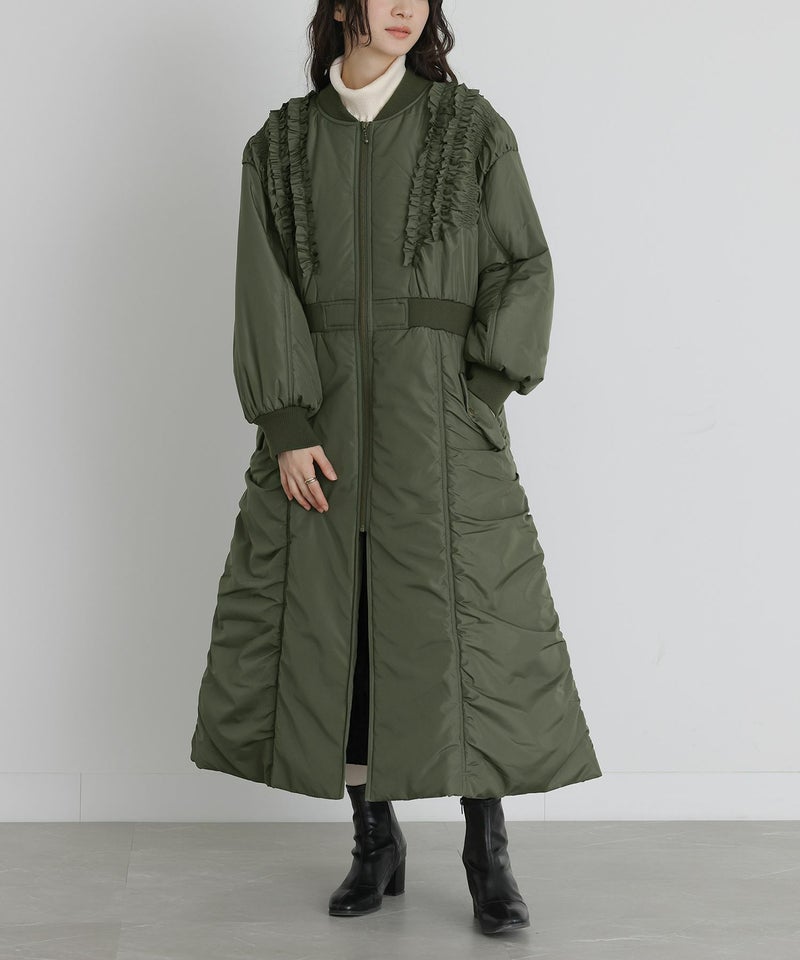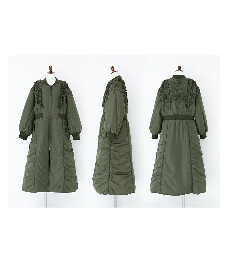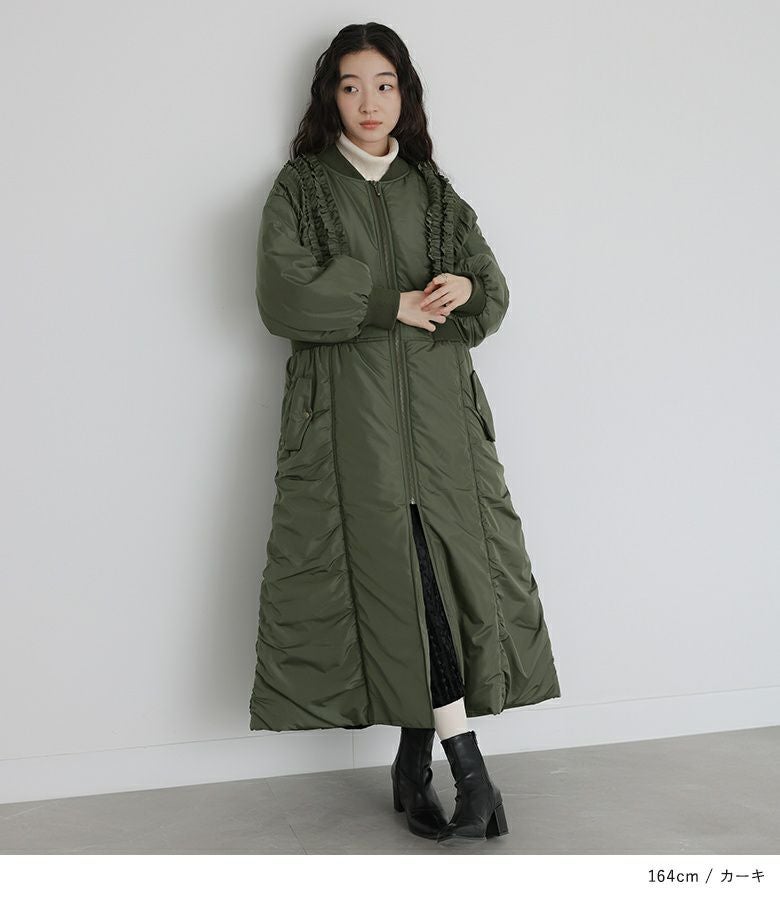 MA-1風のデザインとフリルディテールを組み合わせた中綿入りロングコート。