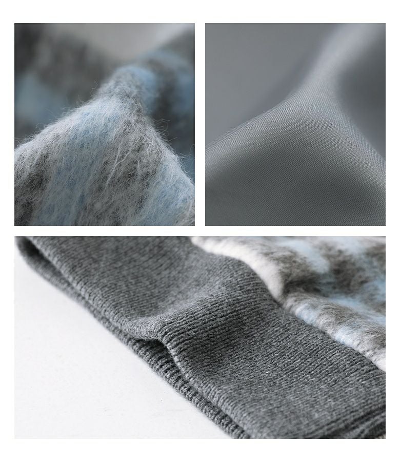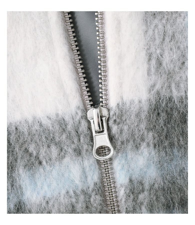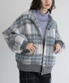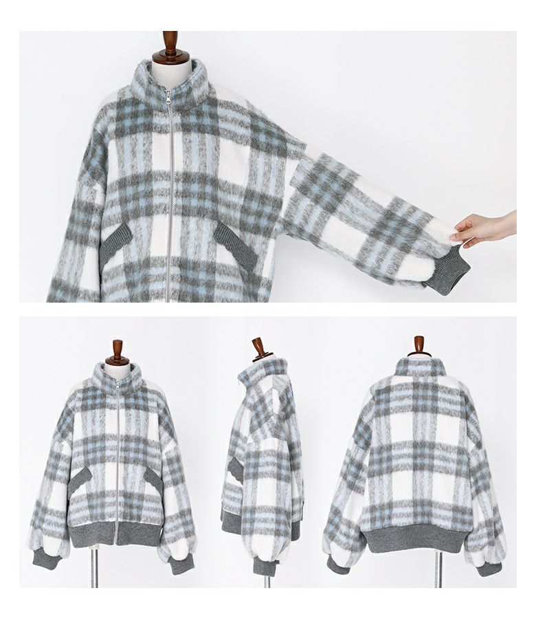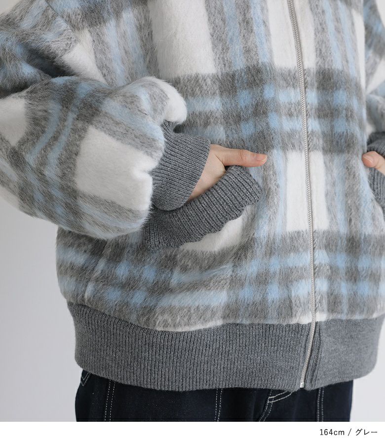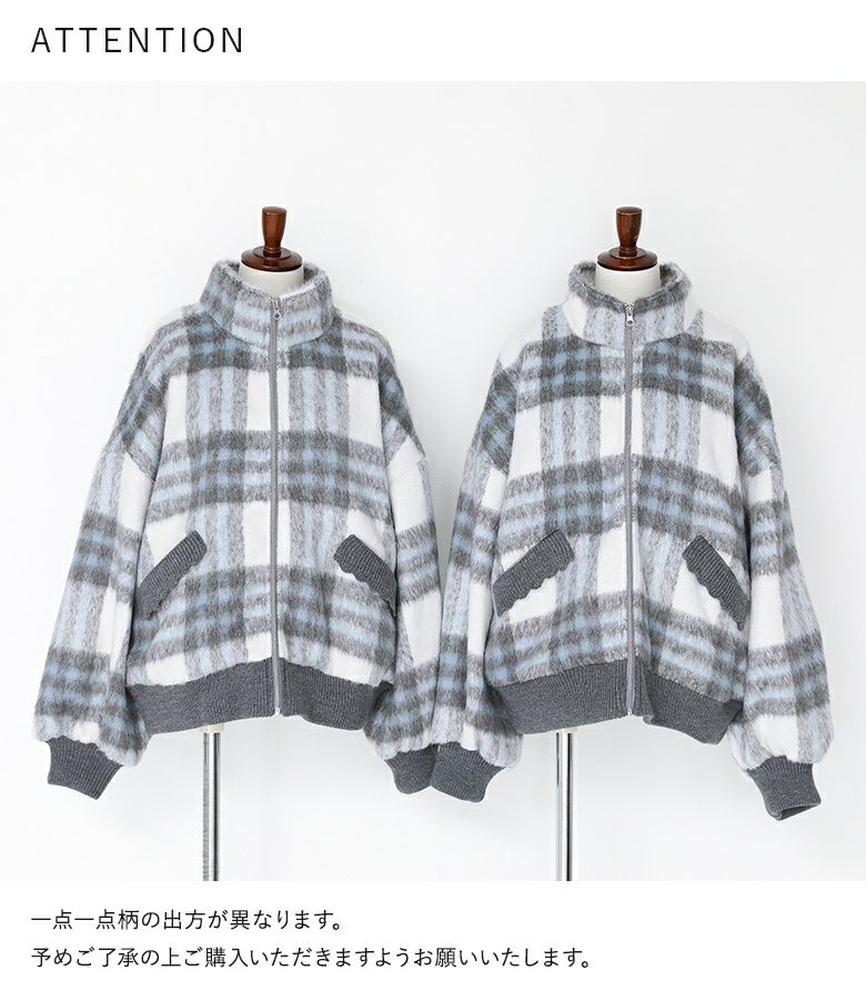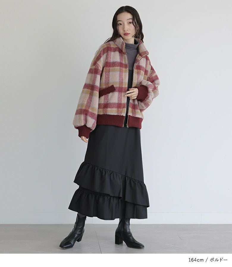 起毛感が暖かみを感じる、チェック柄のシャギー生地。襟・袖口・裾・ポケット部分には伸縮性のあるリブ生地を使用しました。軽やかで快適な着心地の一着です。滑りの良い裏地付きで着脱もスムーズにできます。