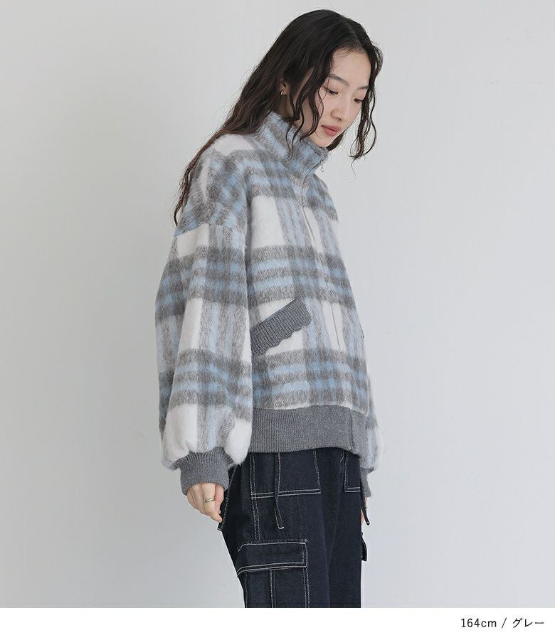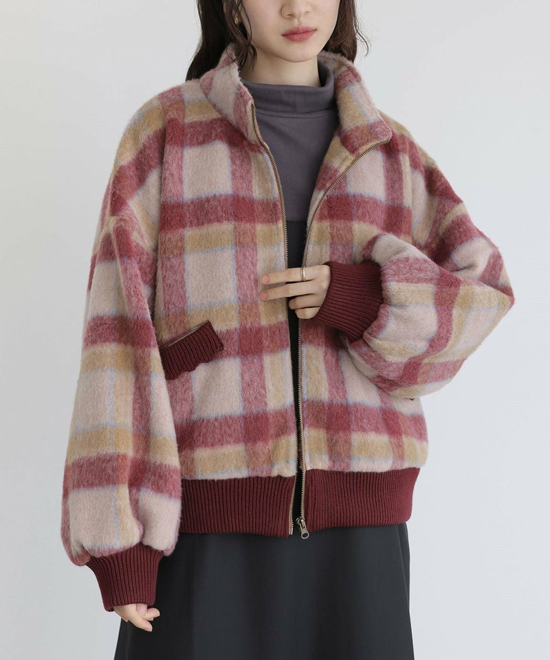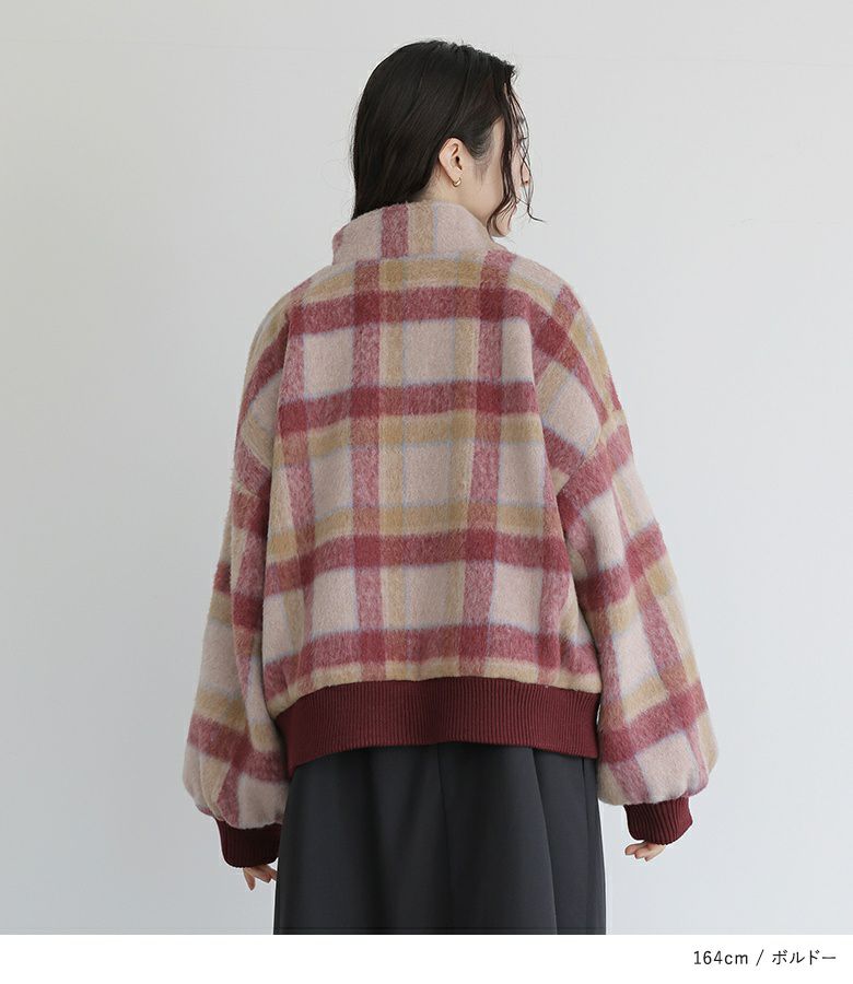 多色使いのチェック柄が目を惹くショートコート。ぽわん袖のシルエットが大人可愛い印象の一着です。ポケット口はスカラップ編みのリブデザインとなっており、コーディネートのポイントに。ショート丈でスタイルアップ効果も期待できます。