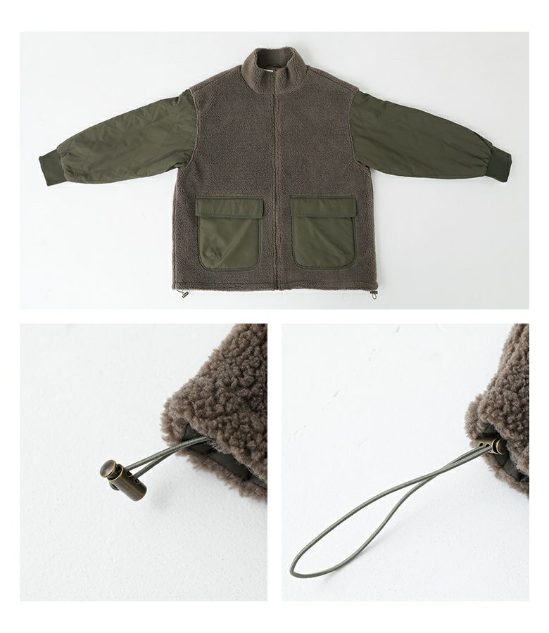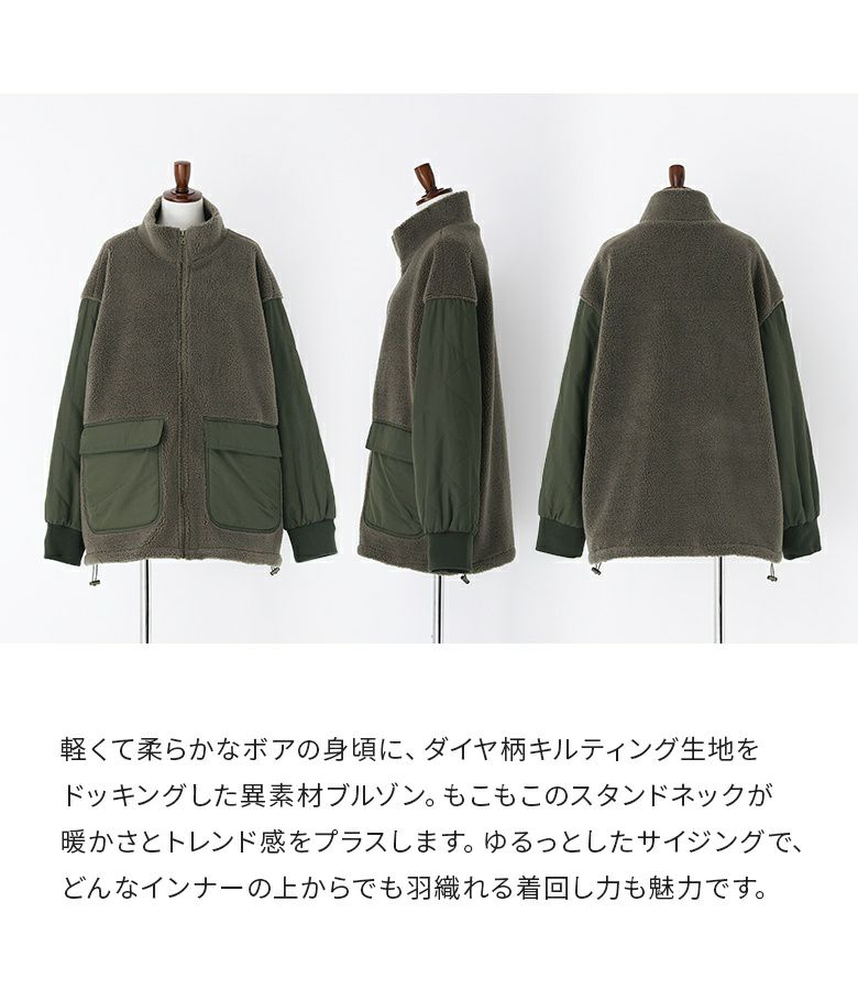 軽くて柔らかなボア×ダイヤ柄キルティング生地をドッキングした異素材ブルゾン。