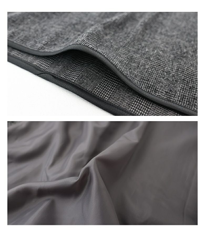 ストールの周囲やポケットの玉縁布、脇タブには合皮を使用し、上品なアクセントをプラス。