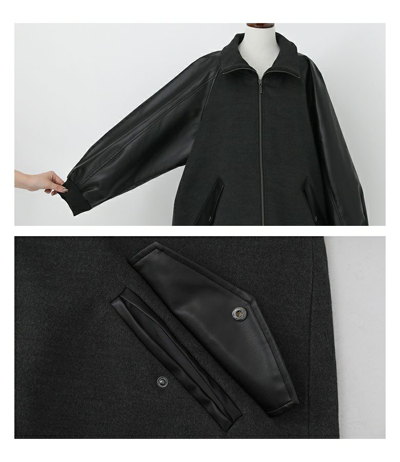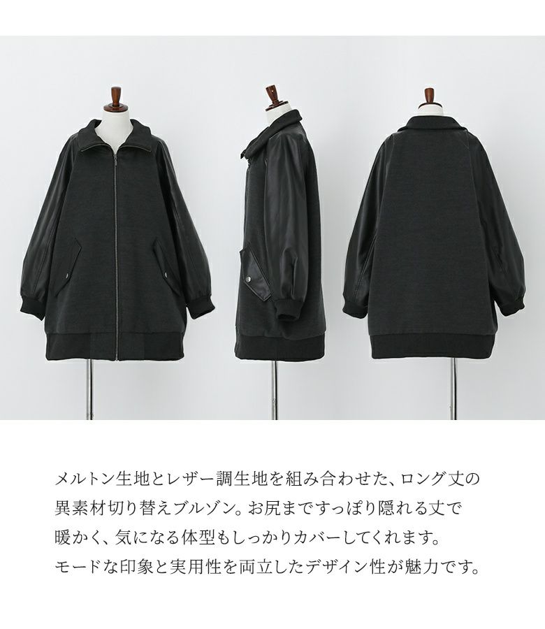 メルトン生地×レザー調生地を切替えたロング丈の異素材切替ブルゾン。