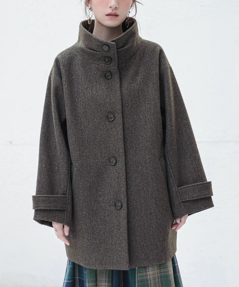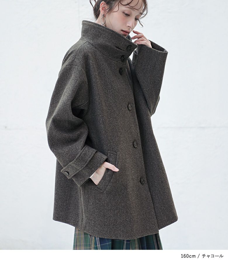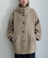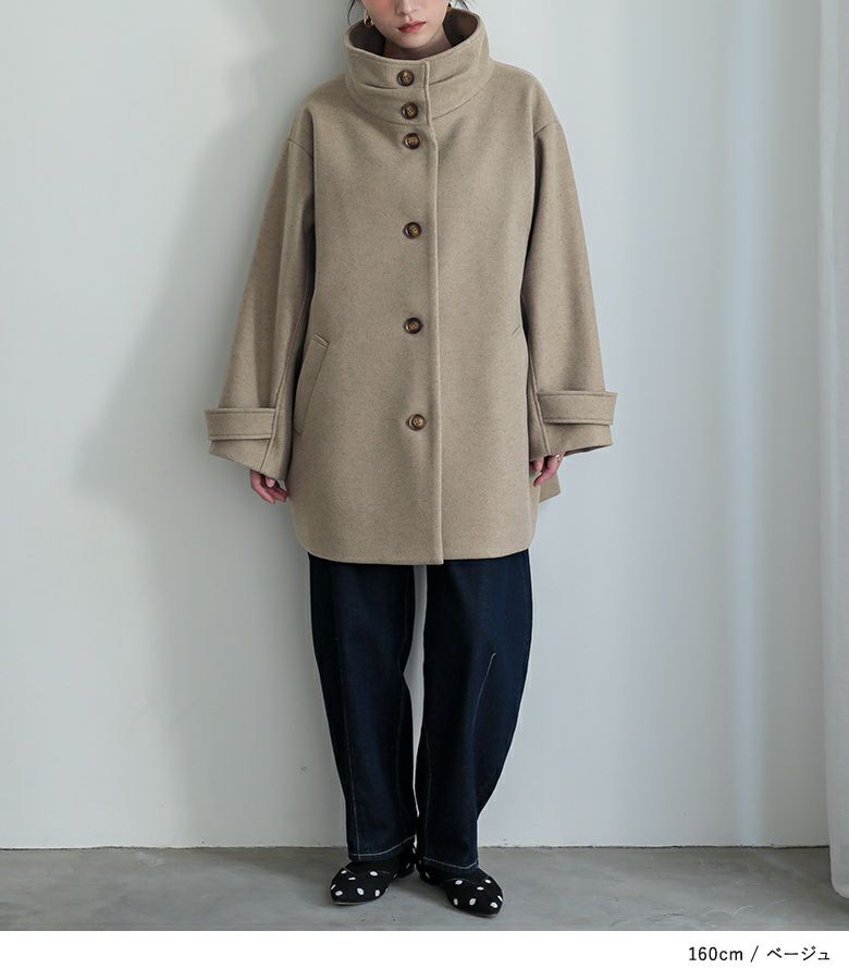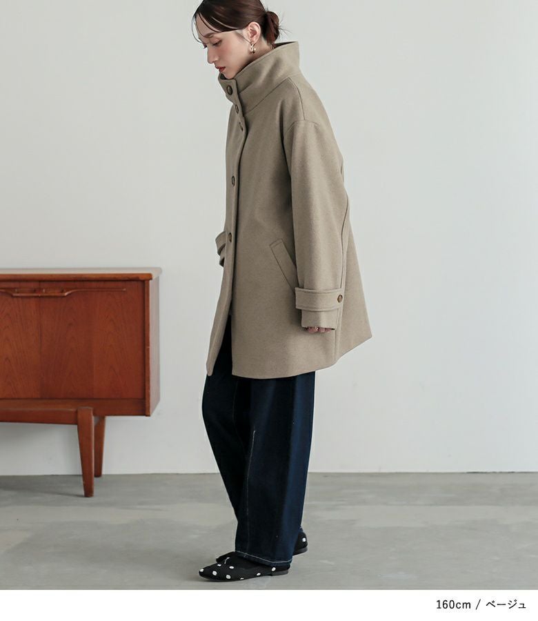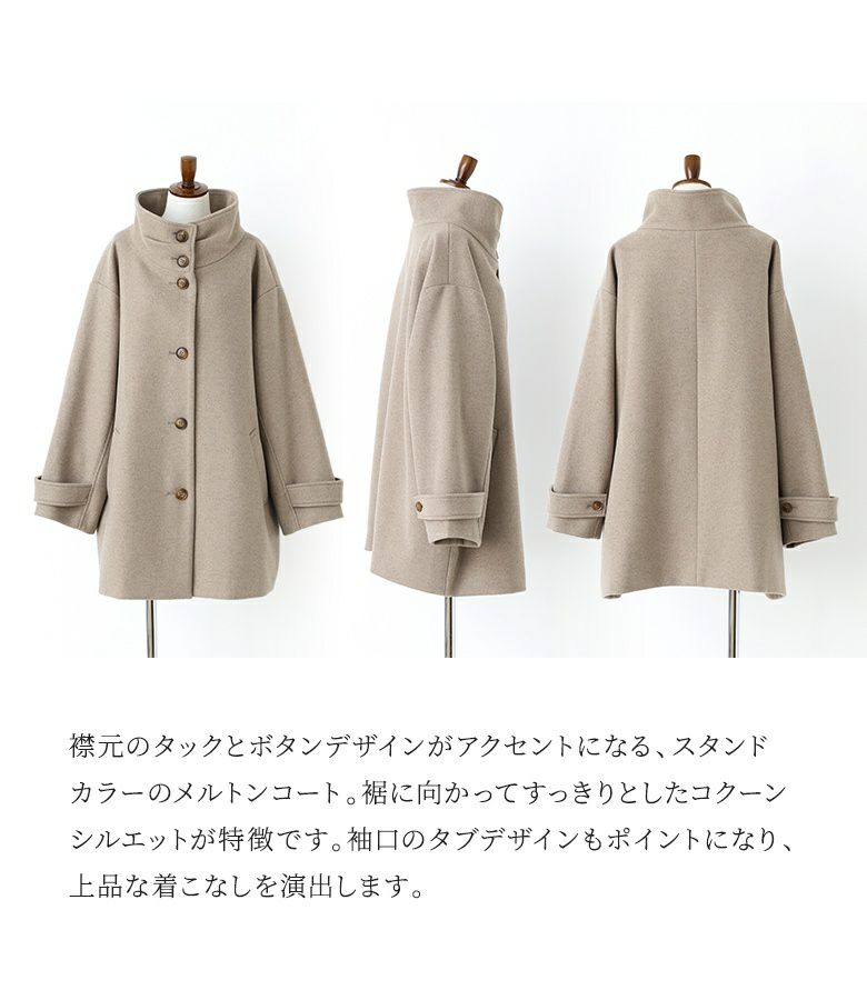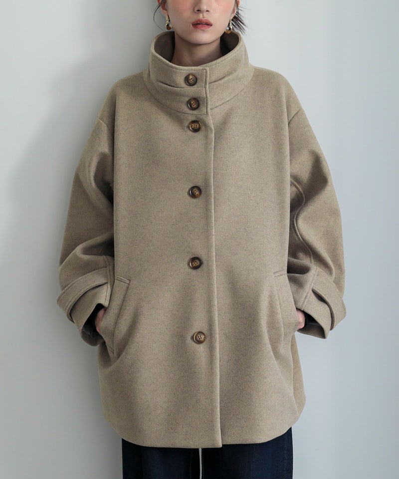 タックとボタンがアクセントになった、スタンドカラーのメルトンコート。