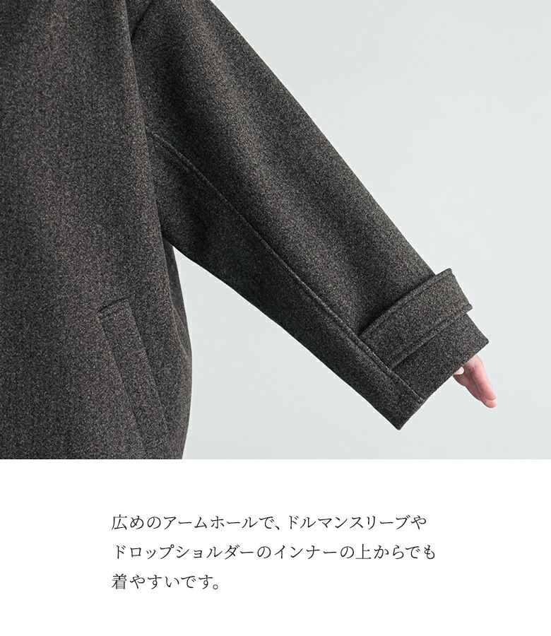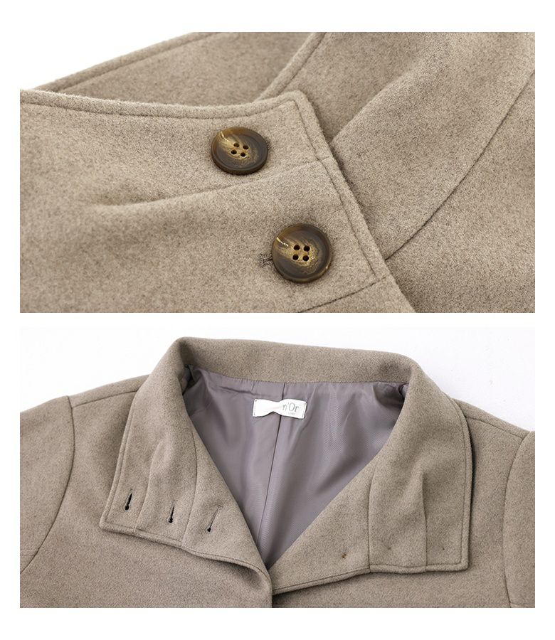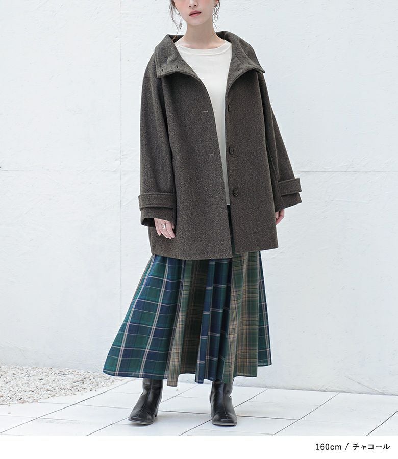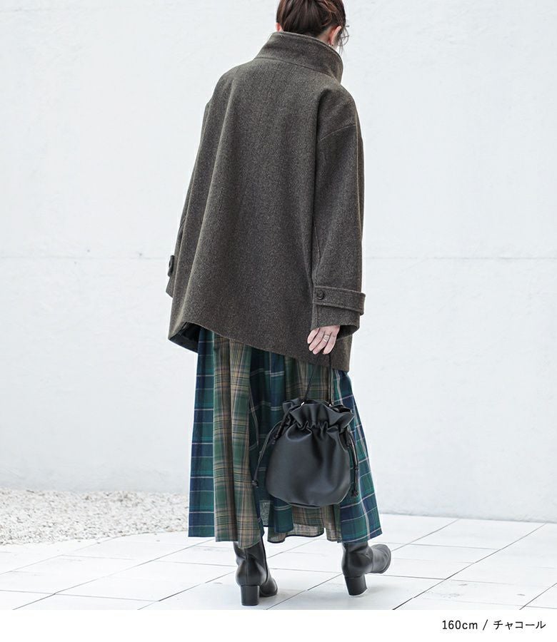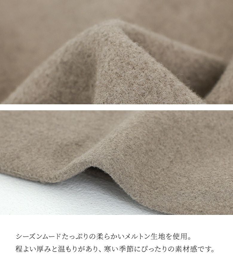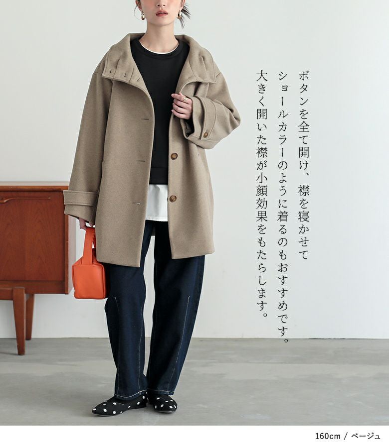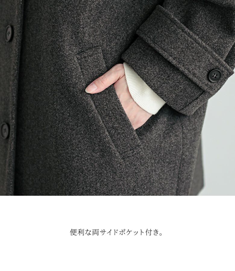 タックとボタンがアクセントになった、スタンドカラーのメルトンコート。