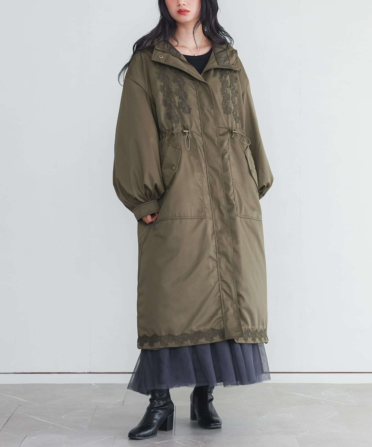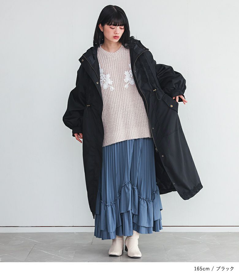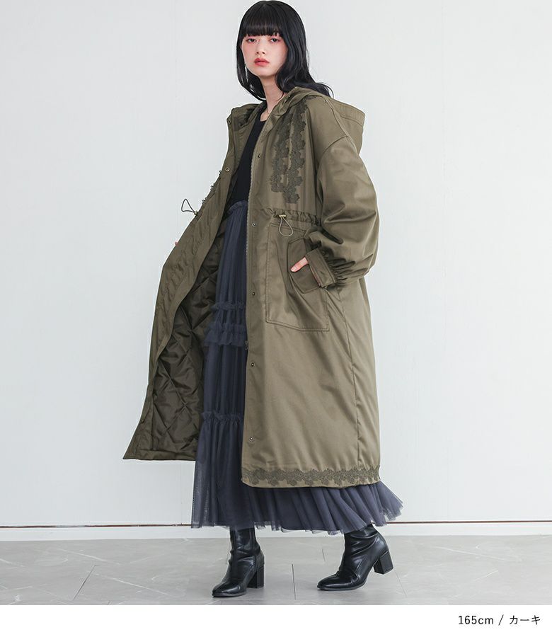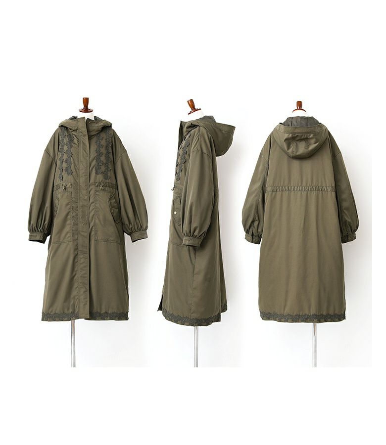 身頃と裾にモチーフレースをあしらったモッズコート。