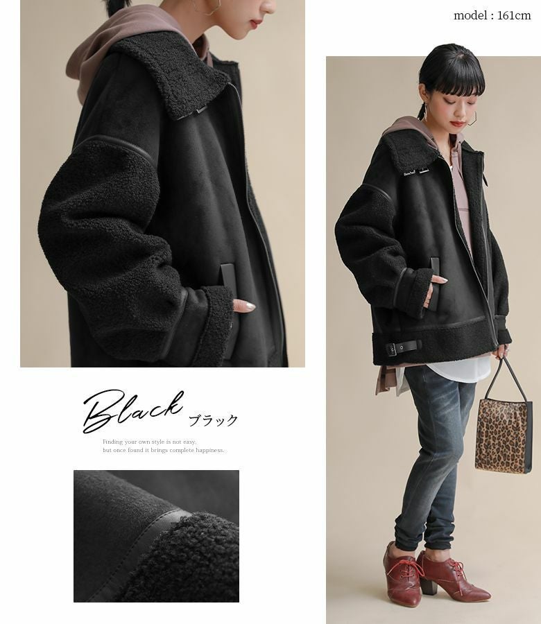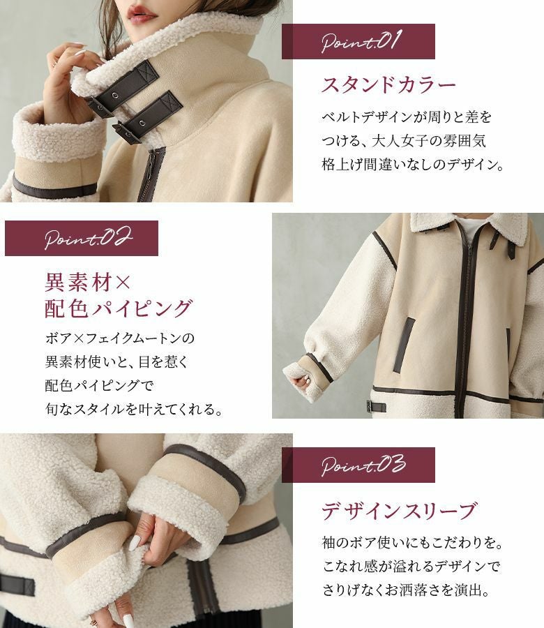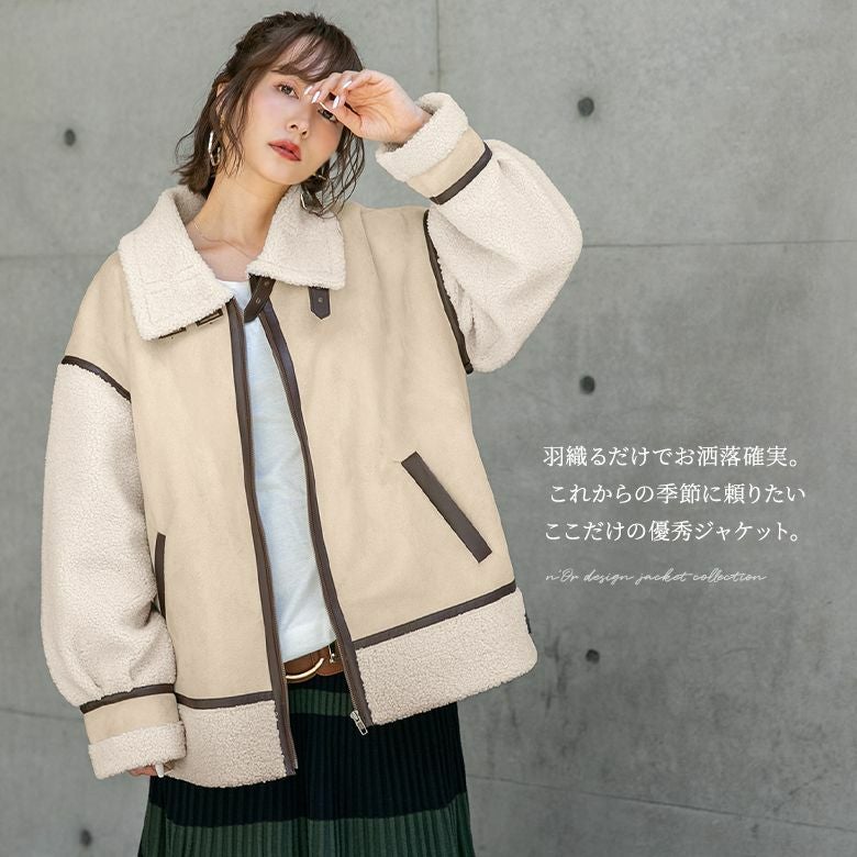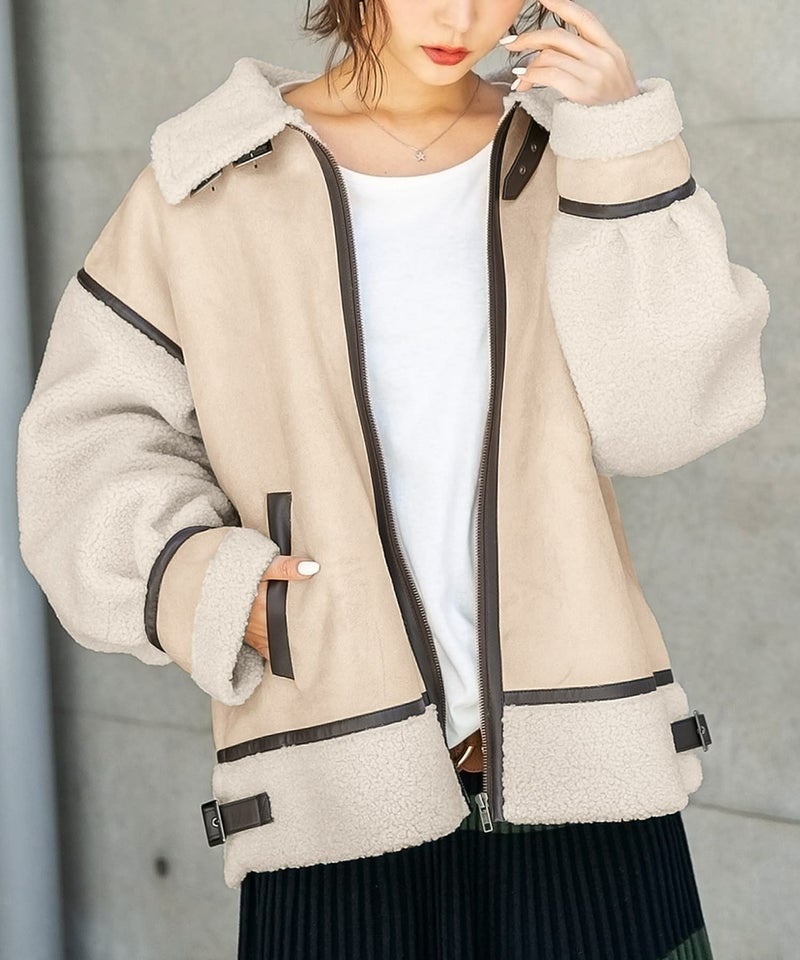 リングボア×フェイクムートンの異素材ドッキングと、アクセントになるパイピングレザーで旬なスタイルを叶える配色デザインジャケット♪