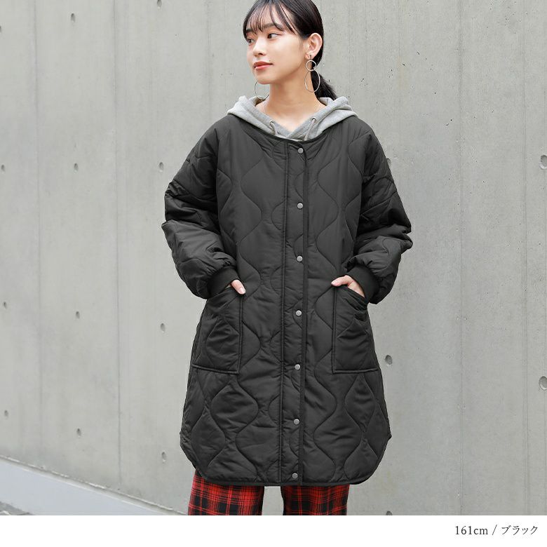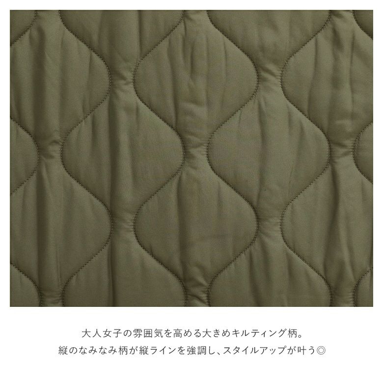 肩落ちシルエットでゆるっとラフに着られる中綿入りキルティングコート。スカートにもパンツにも合わせやすく、軽くて気軽に羽織れる優秀な一着です。