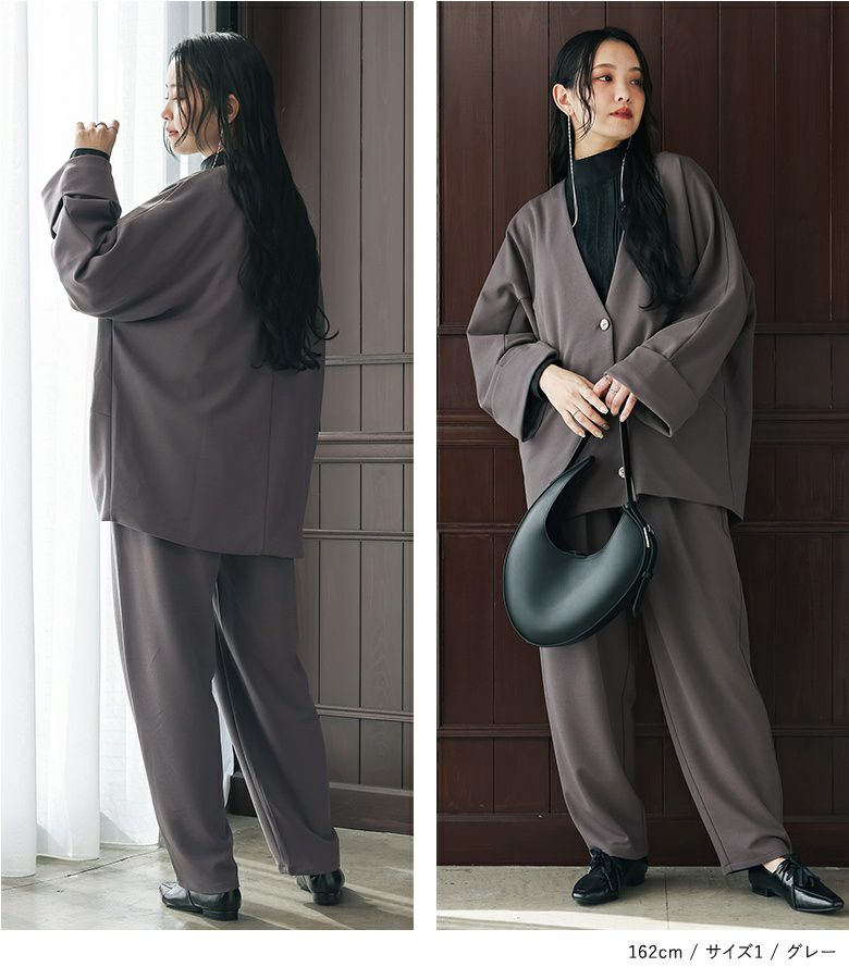 【普段着用】 Tops: S/M Bottoms:S/M | 【1】 ◆ジャケット 袖丈:手の甲にかかる位 着丈:太ももにかかる位 ◆パンツ 着丈(ウエスト穿き):かかとが隠れる位 ウエスト:ややゆったり