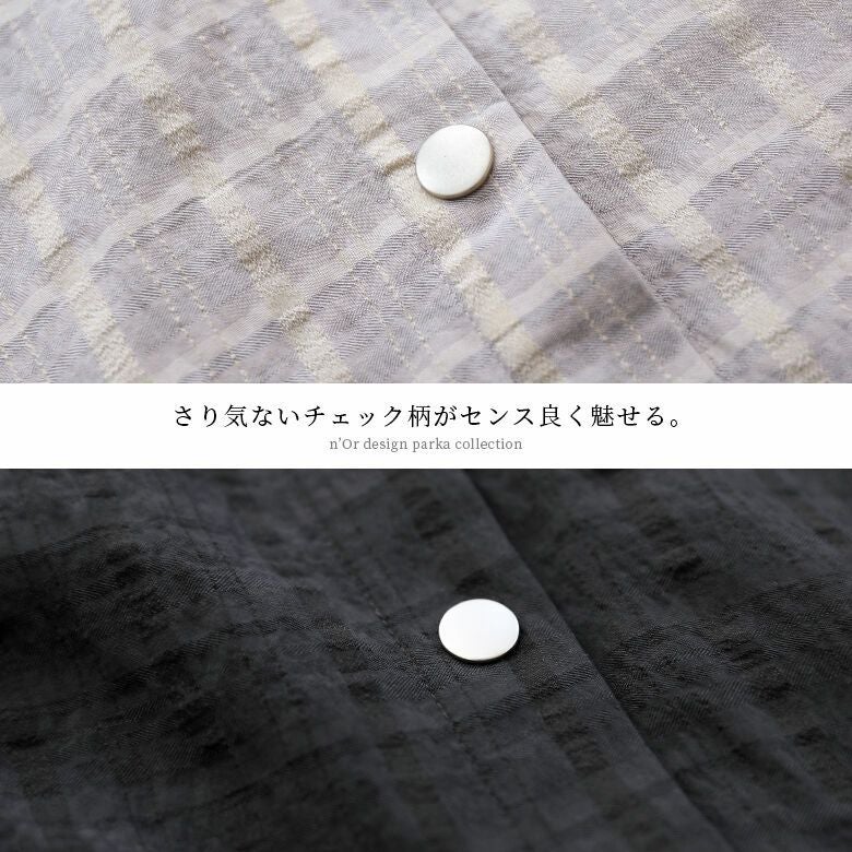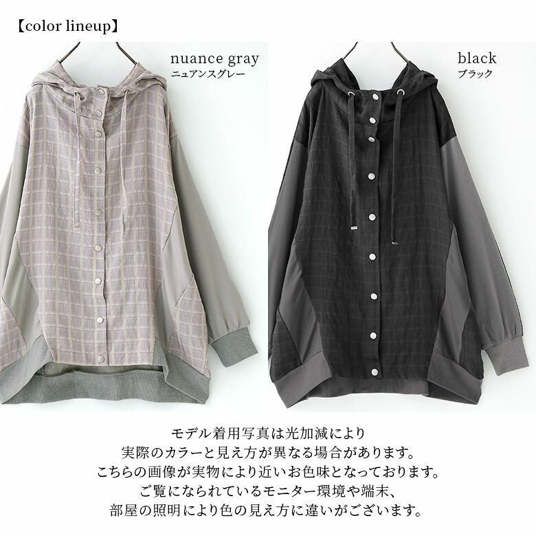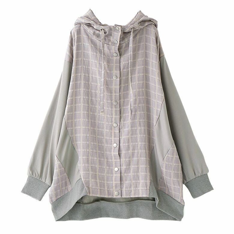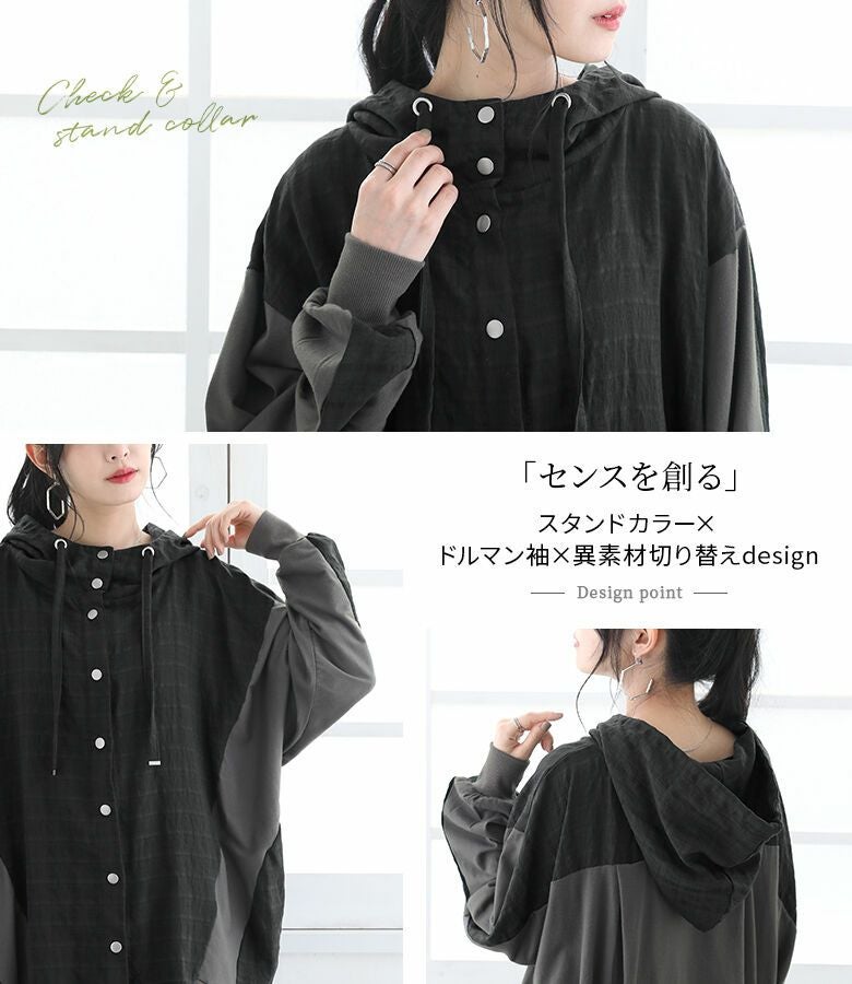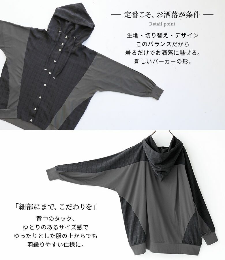 チェック柄の布帛生地と無地のカットソー生地を組み合わせた、絶妙な異素材バランス。バックスタイルのアクセントにもなる大きめフードは、襟元がスタンドカラー仕様で顔周りをスッキリ魅せてくれます。