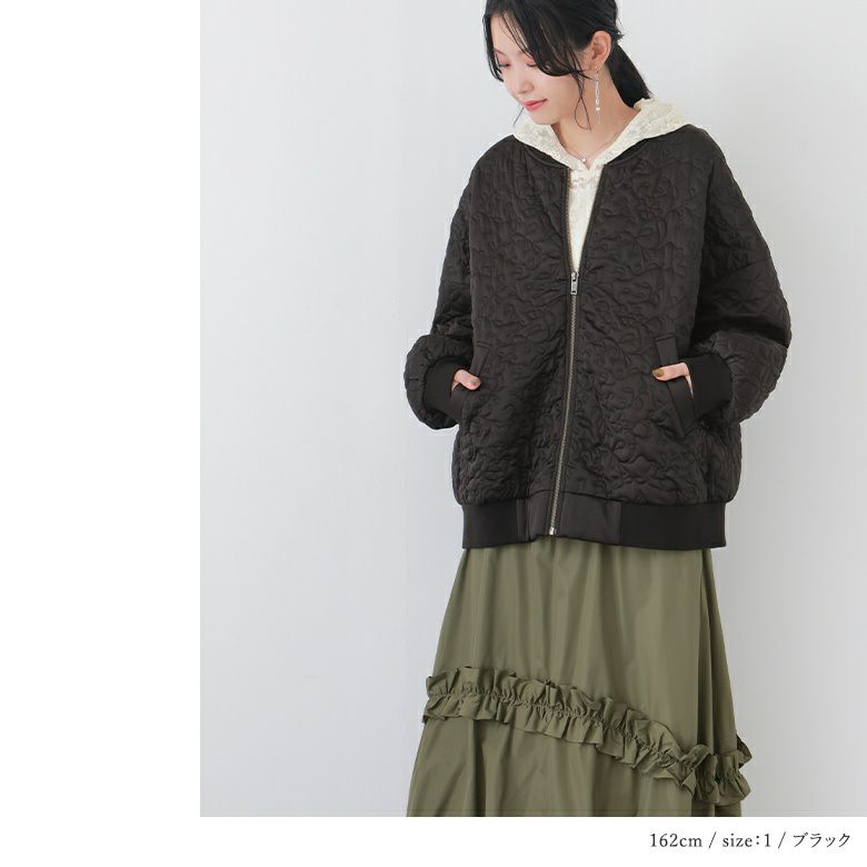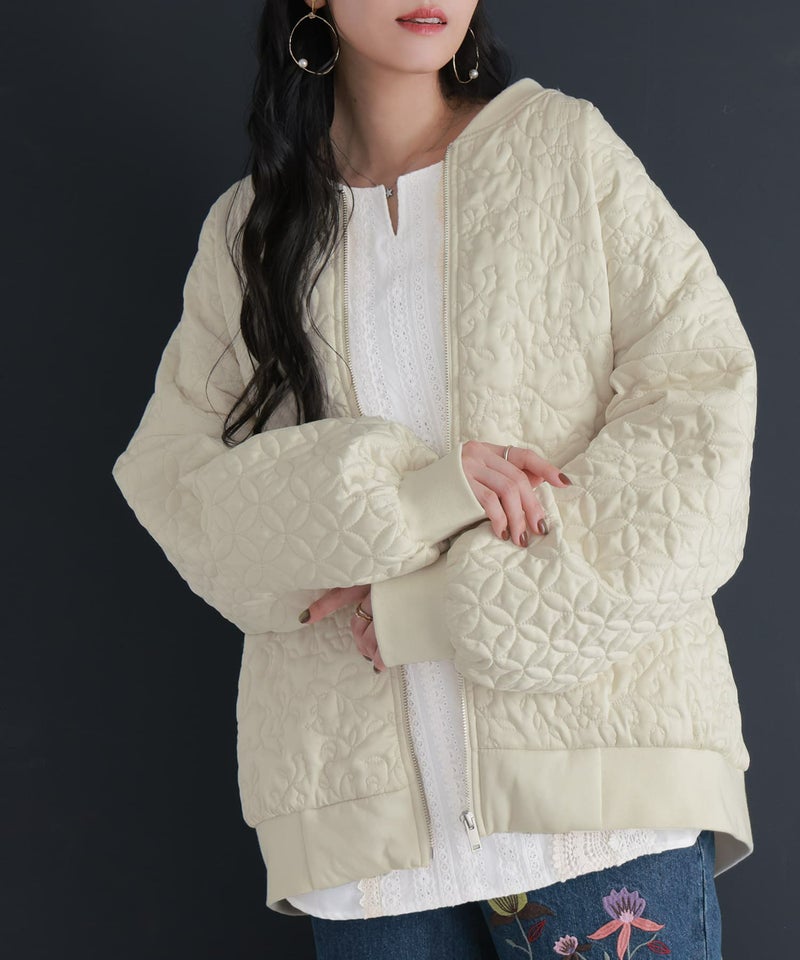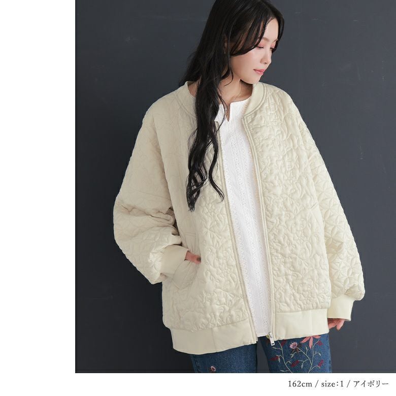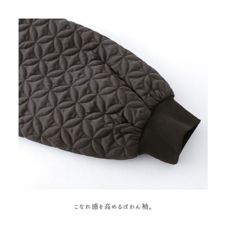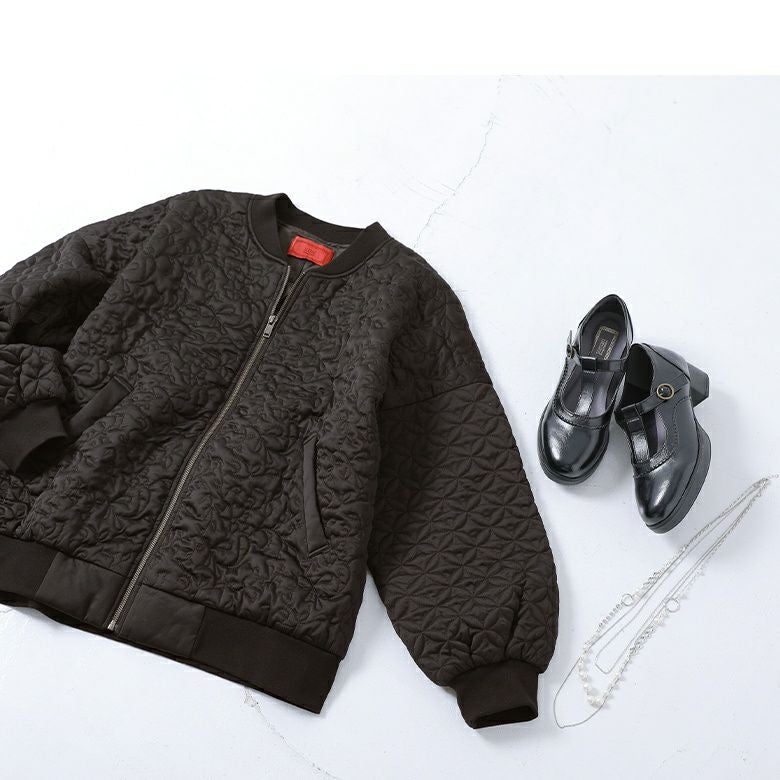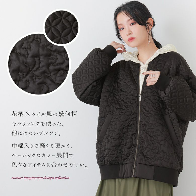花柄×タイル風の幾何柄キルティングを使った、他にはないブルゾン。中綿入りで軽くて暖かく、ベーシックなカラー展開で色々なアイテムに合わせやすい。