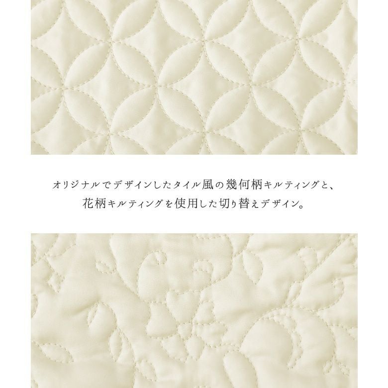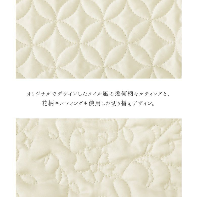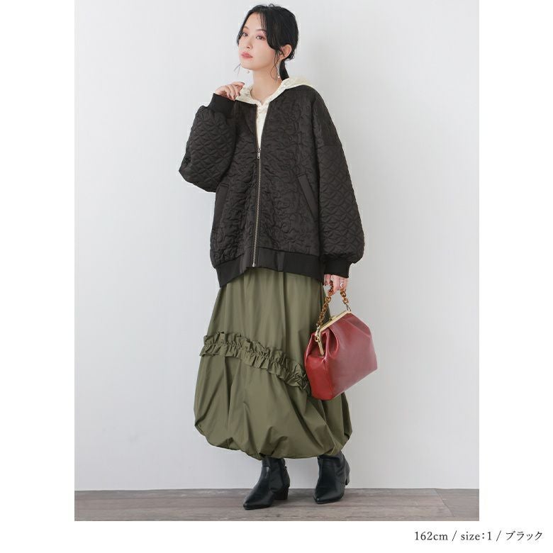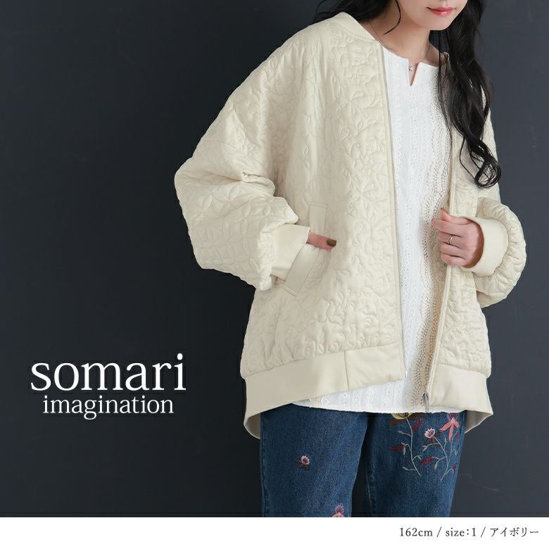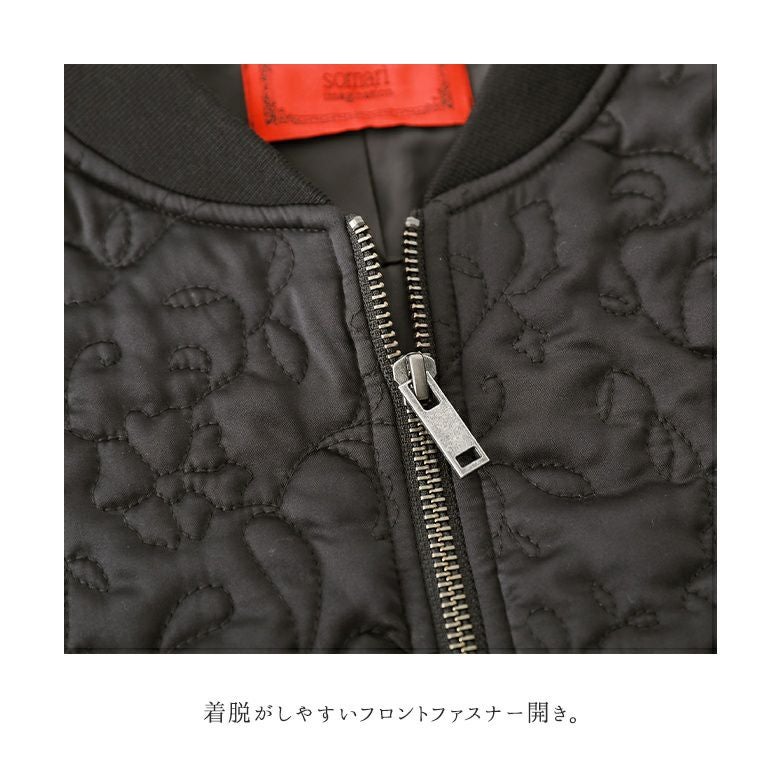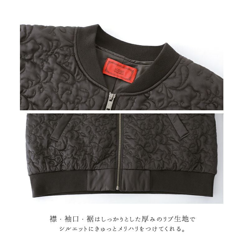 花柄×タイル風の幾何柄キルティングを使った、他にはないブルゾン。中綿入りで軽くて暖かく、ベーシックなカラー展開で色々なアイテムに合わせやすい。