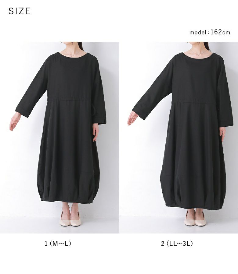 1(M~L)は、程よいゆとりをもって楽に着られました。ワンピースは身幅がゆったりしていますが、ウエストをブラウジングできるので大きく見えずに着られました♪2(LL~3L)は全体的に私にはゆったりめでした。私の場合は、1(M~L)を選びます。