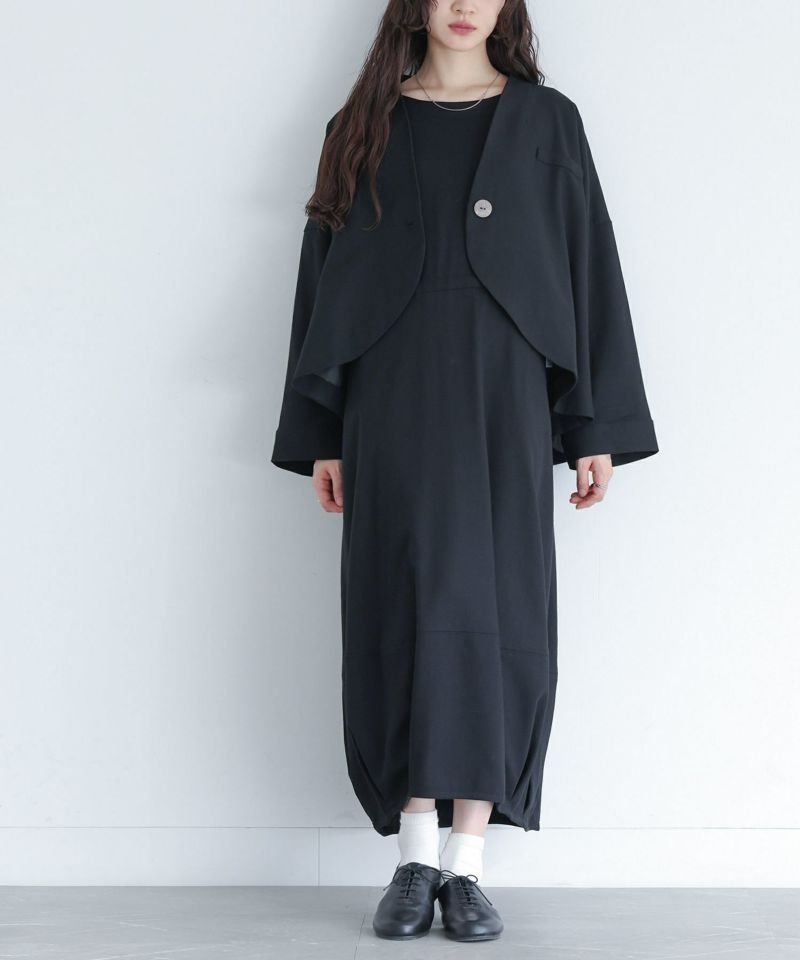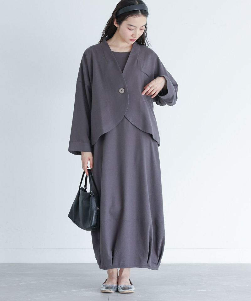 たっぷりのドレープラインが美しい、前後差のあるショート丈ジャケット&裾のタックでふわっとしたコクーンシルエットのワンピースは、それぞれ単品で着用もできて、お洒落の幅が広がります。