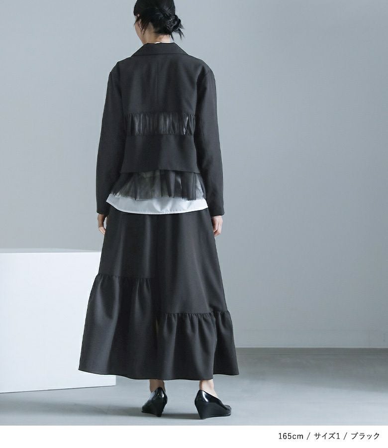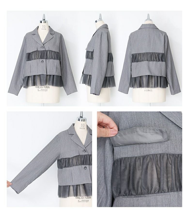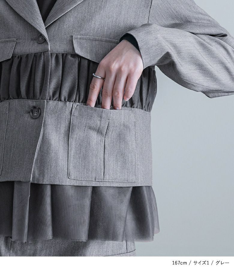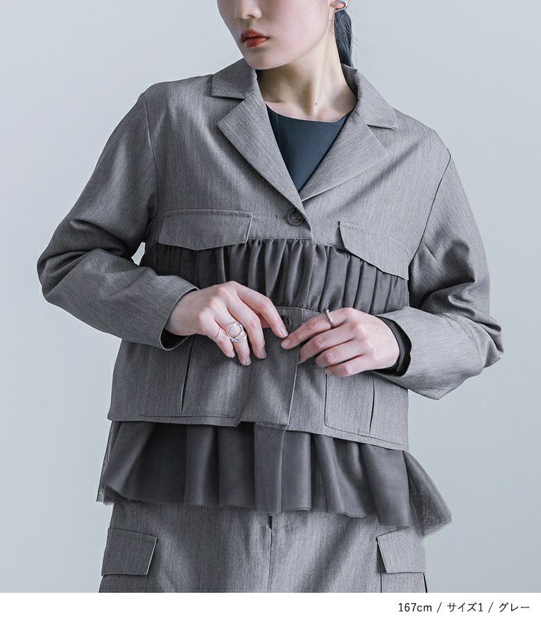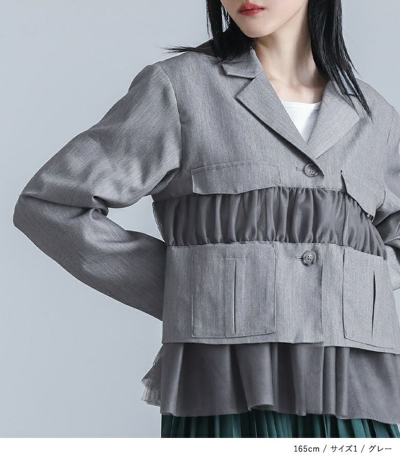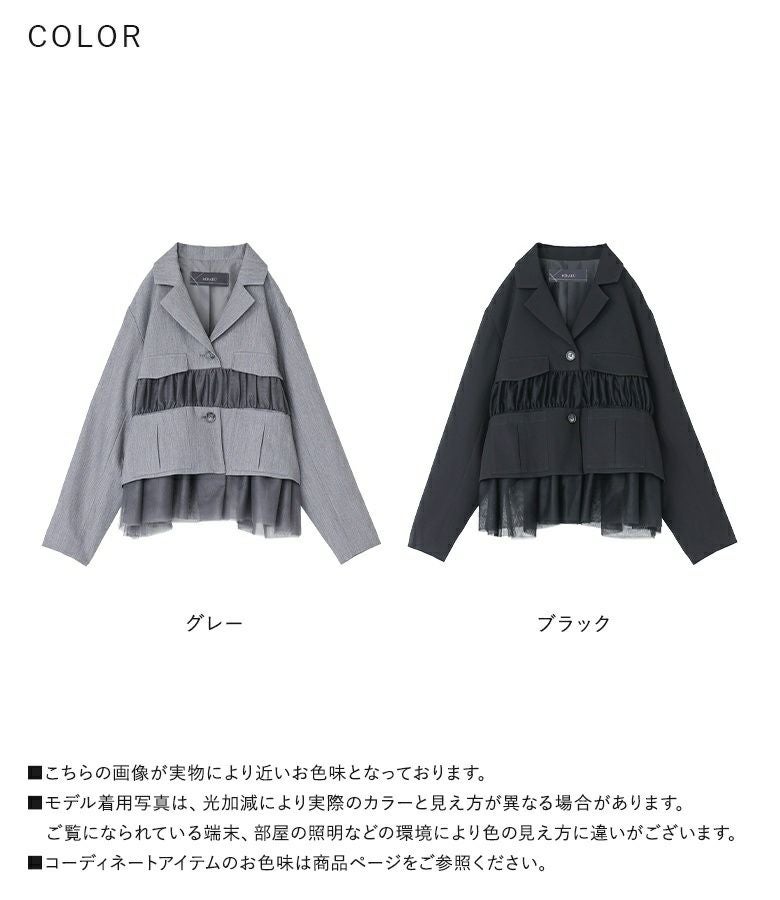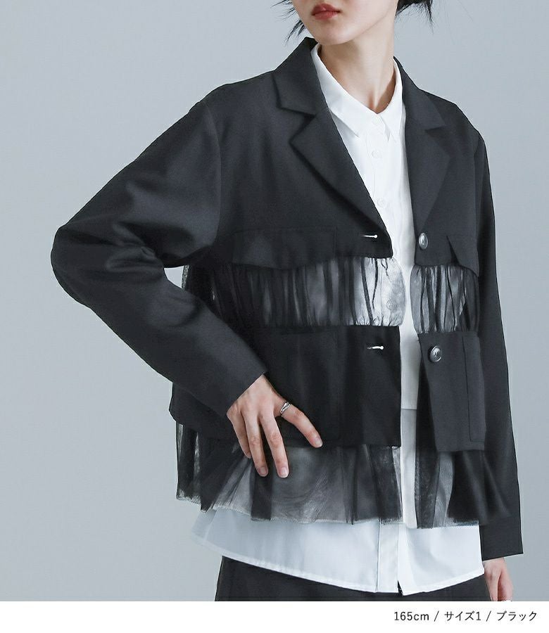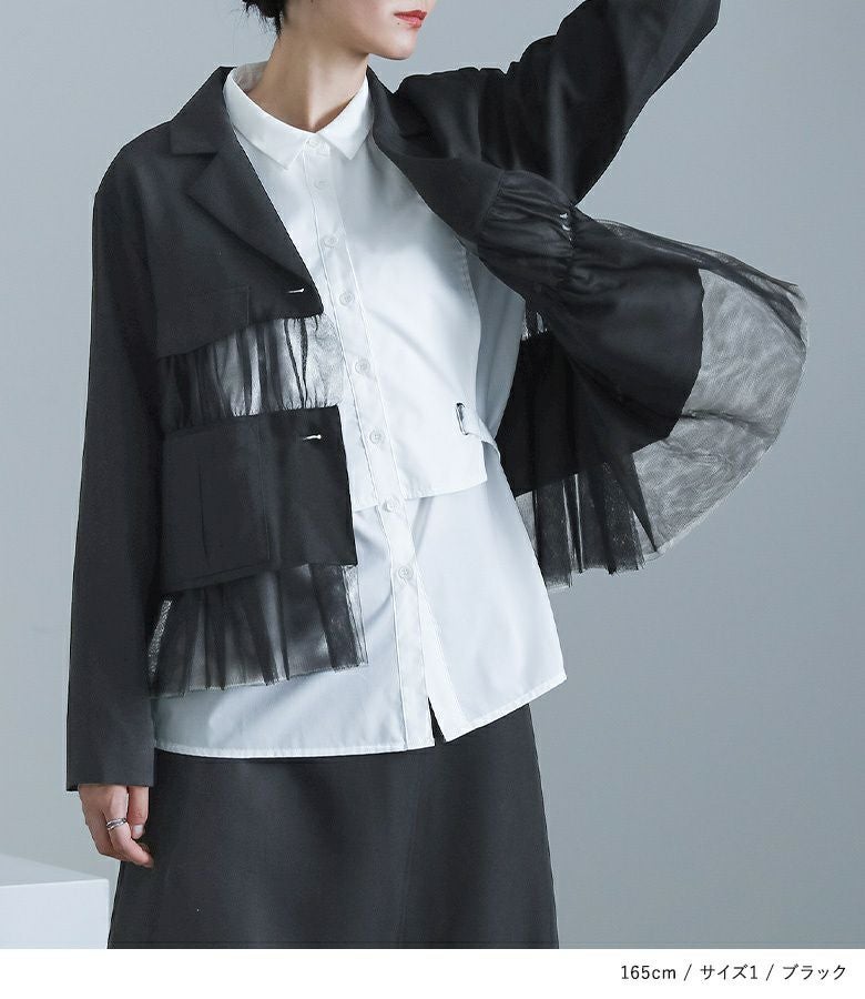 他の画像を見る 選べる2サイズ展開!チュールと布帛のドッキングデザインが目を引く、モードなジャケット。 【送料無料】『kOhAKUチュール切替ジャケット』【メール便不可】【40】 ¥ 8,980 税込 5.00 (1)