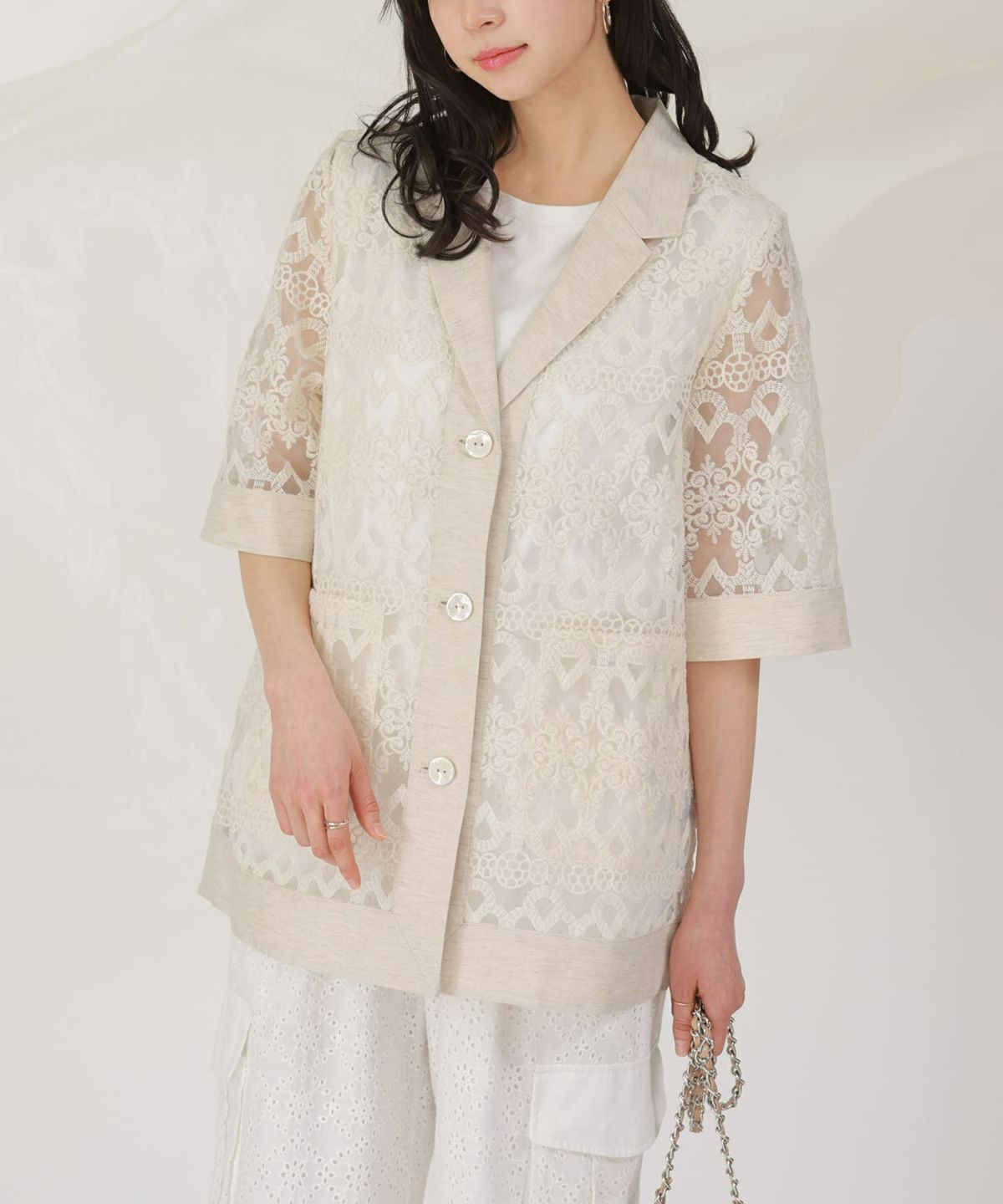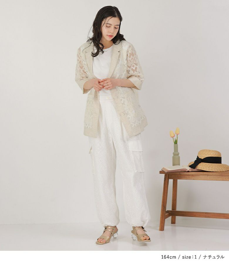 他の画像を見る 選べるM~3Lサイズ展開!豪華な刺繍とシアー感が印象的なジャケット。 【送料無料】『somari imaginationレース×リネン混シアージャケット』【メール便不可】【20】 ¥ 9,980 税込 4.50 (4)