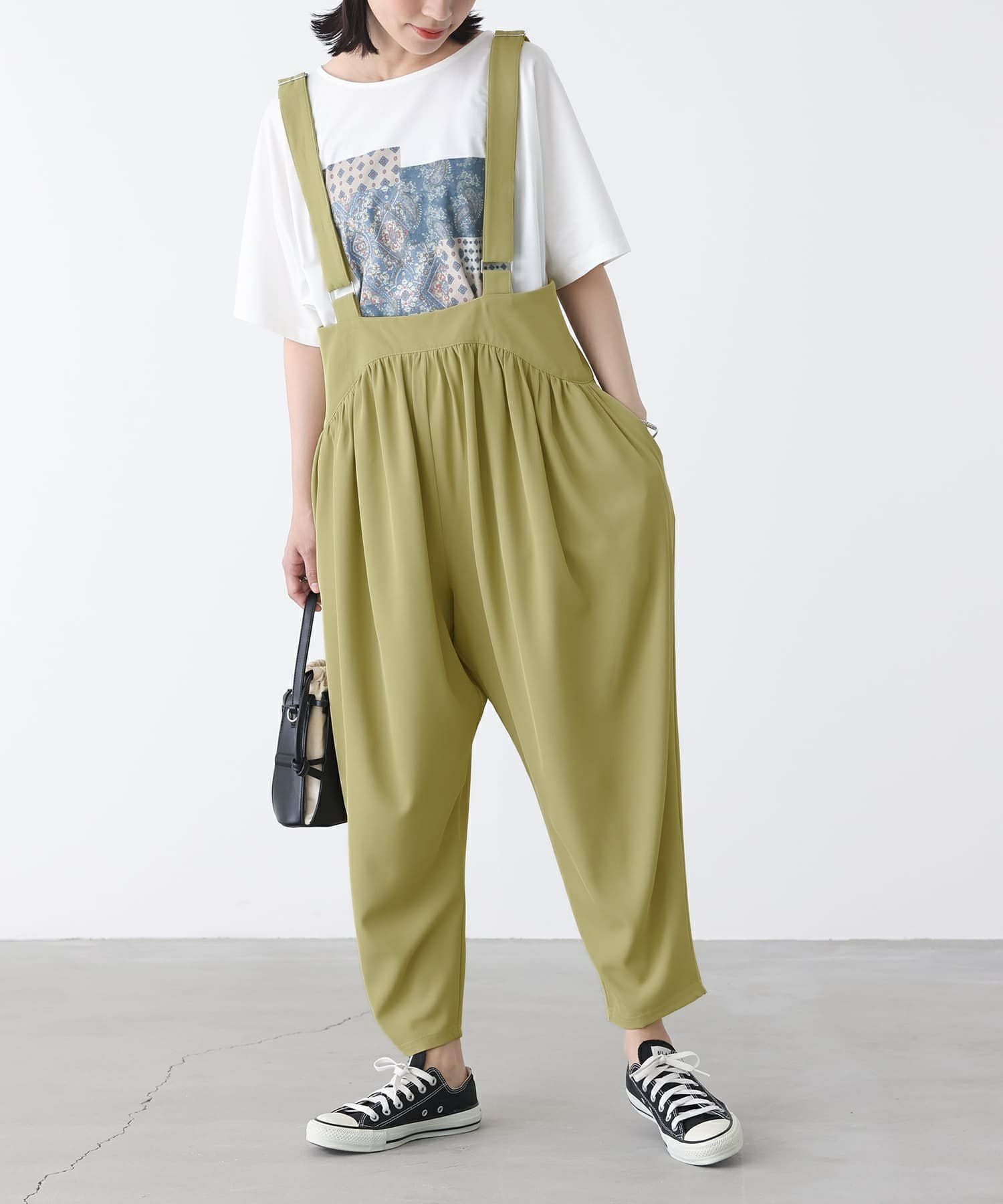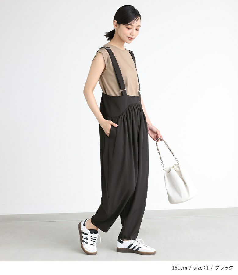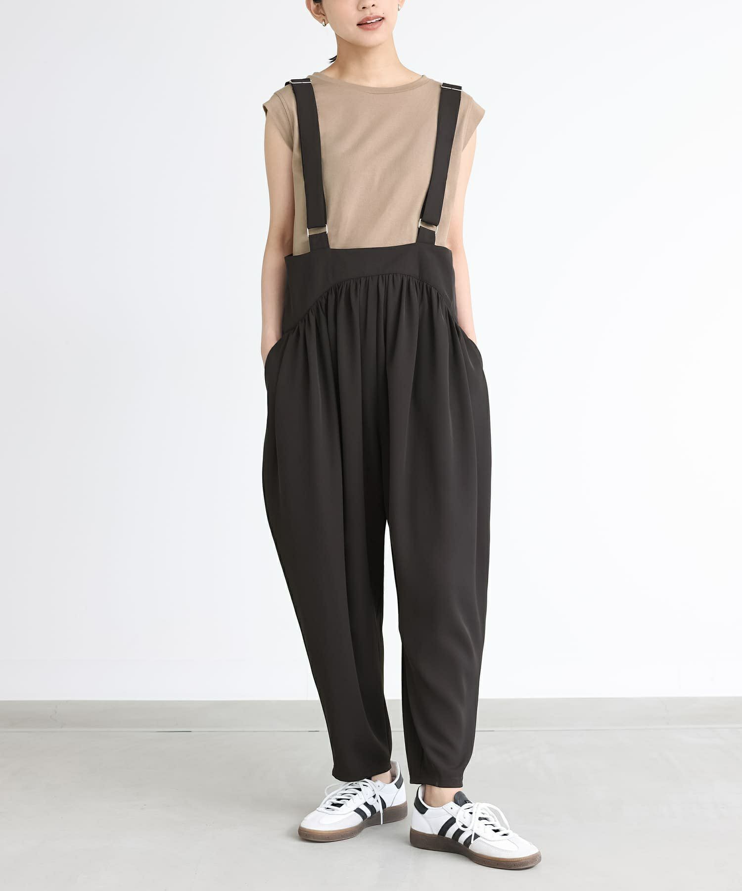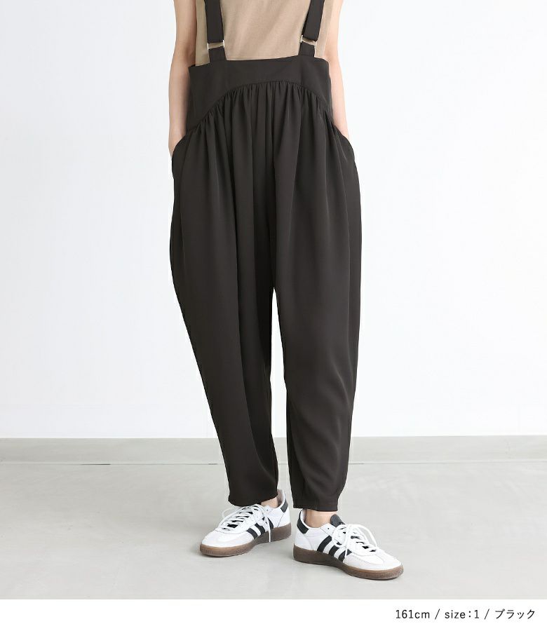 ウエスト下がバルーンシルエットになったテーパードサロペット。ウエスト切り替え下からギャザーを入れて、メリハリのあるシルエットに。