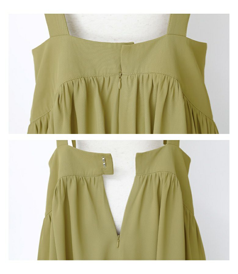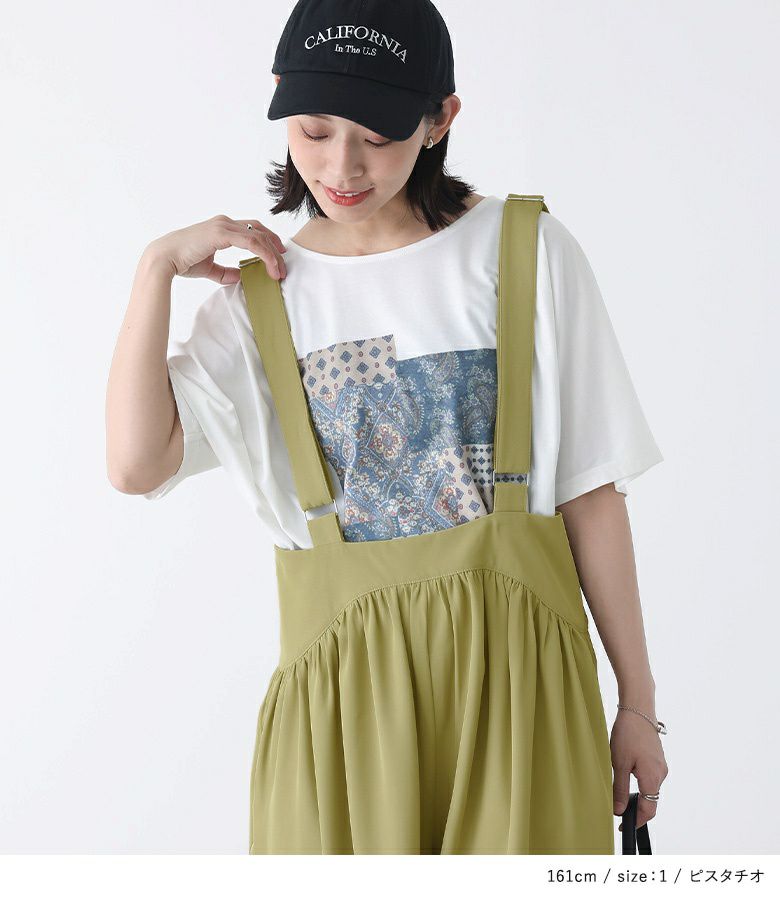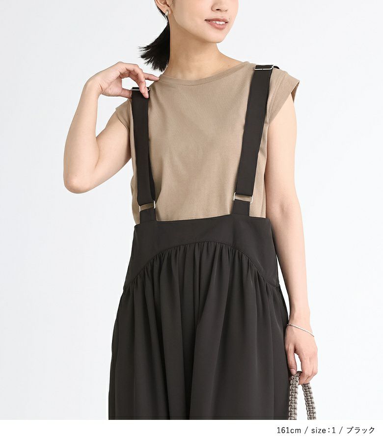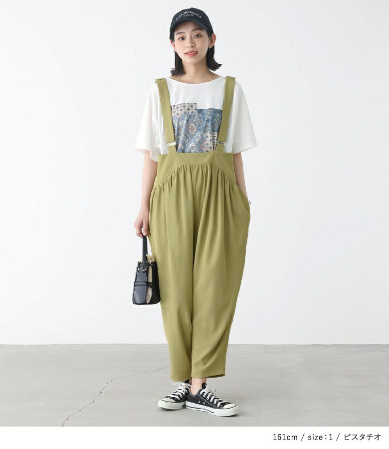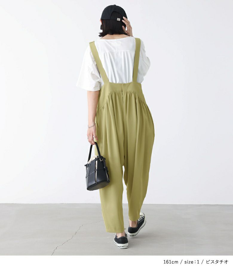 ウエスト下がバルーンシルエットになったテーパードサロペット。ウエスト切り替え下からギャザーを入れて、メリハリのあるシルエットに。