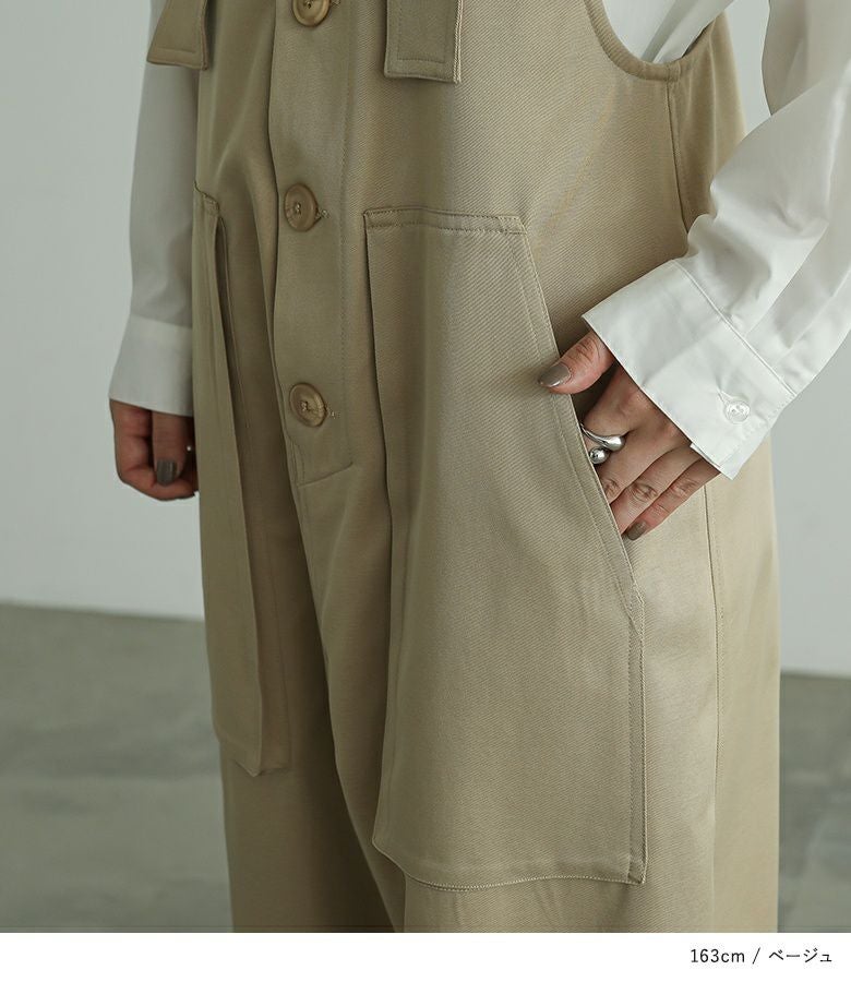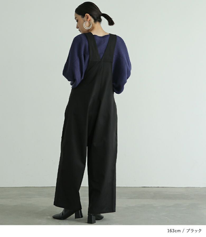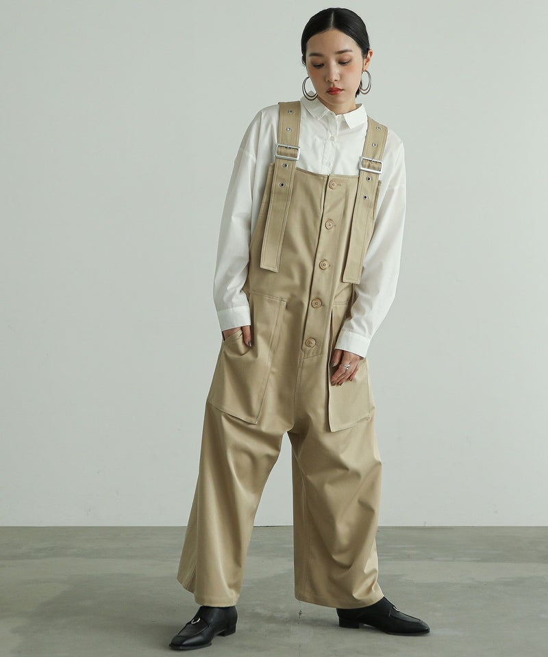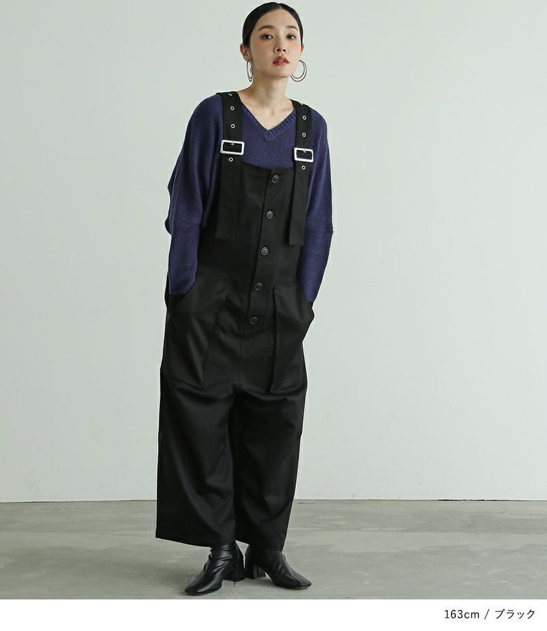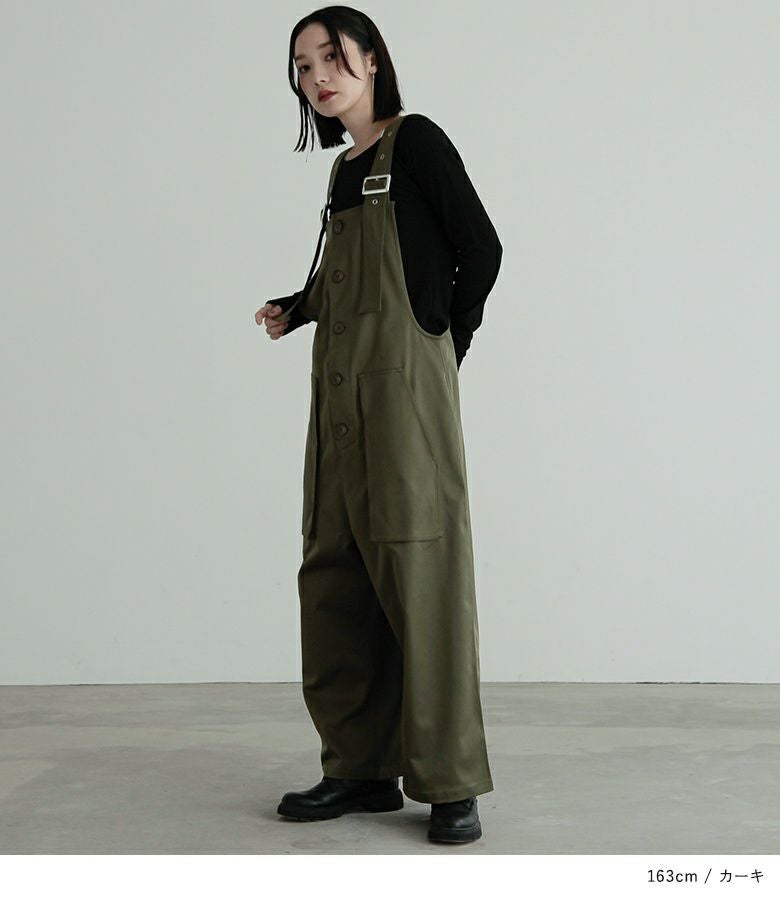 サルエルタイプに仕上げた個性的なデザインのサロペットパンツ。