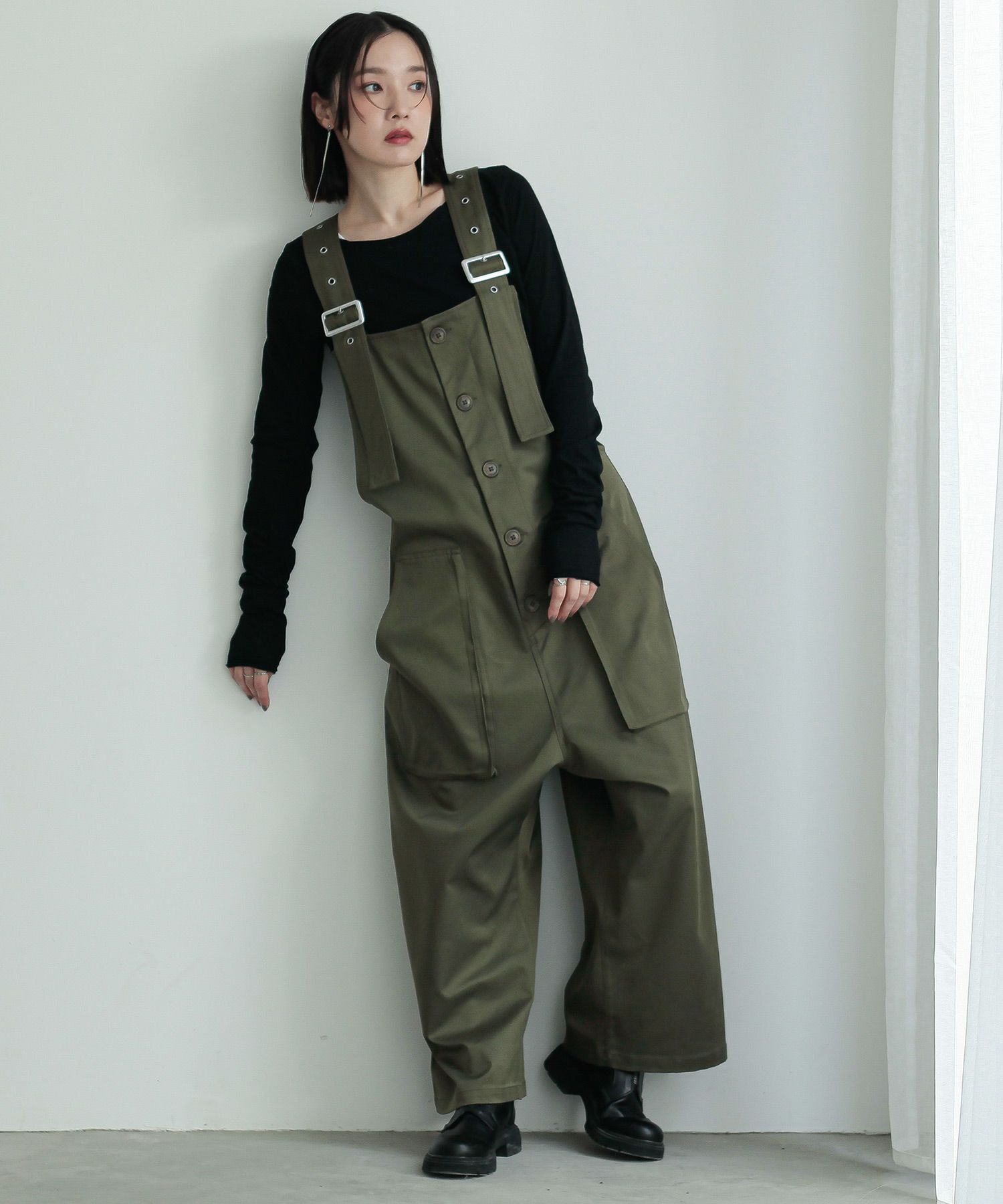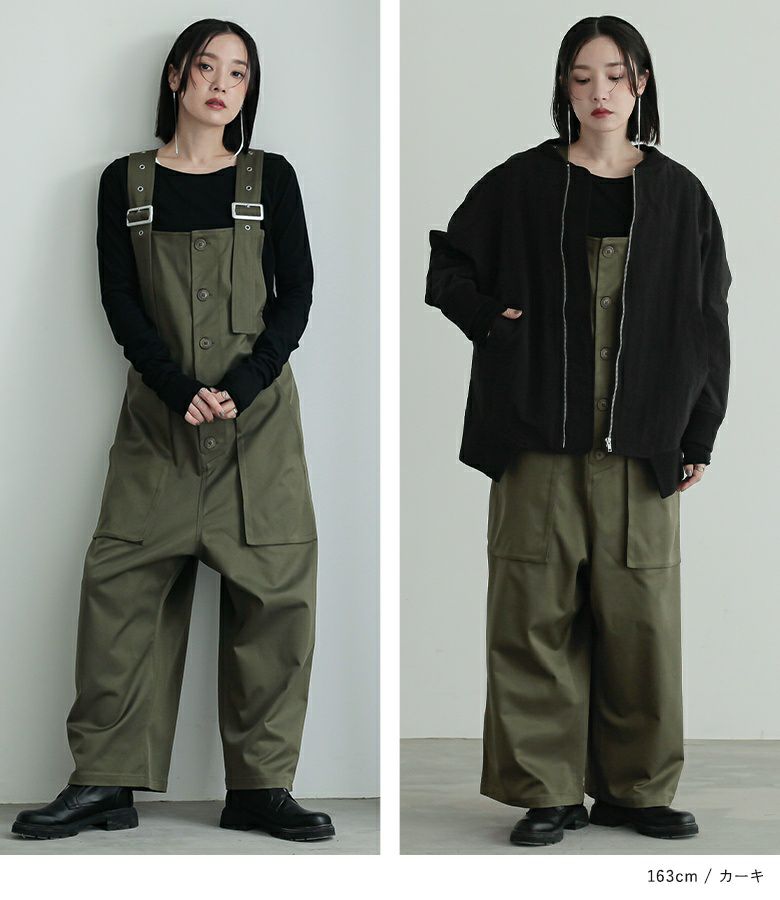 サルエルタイプに仕上げた個性的なデザインのサロペットパンツ。