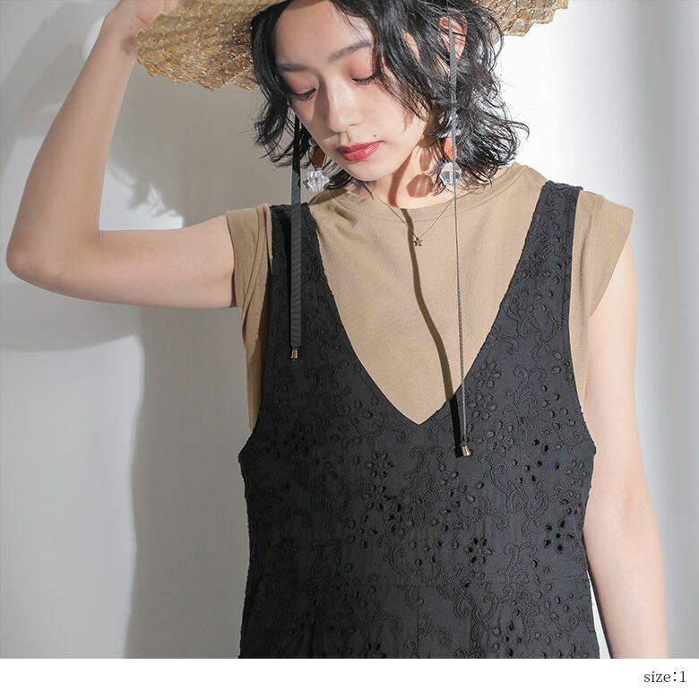 華やかな柄の刺繍レース生地を贅沢に使い、柄が映えるシンプルシルエットと、前後深めのVネックが大人っぽくすっきり魅せる一着です。