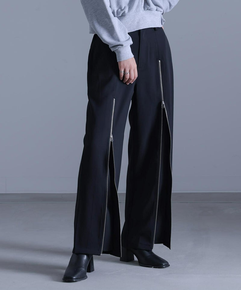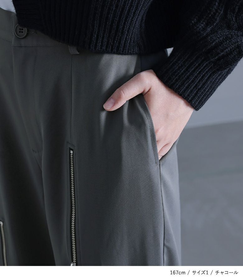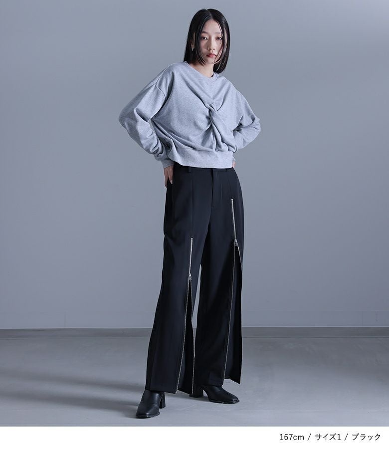ウエストにややゆとりがあるので、薄手のニットなどもインして履きやすそうです。全体的にゆとりがありながらもスッキリ見えます。