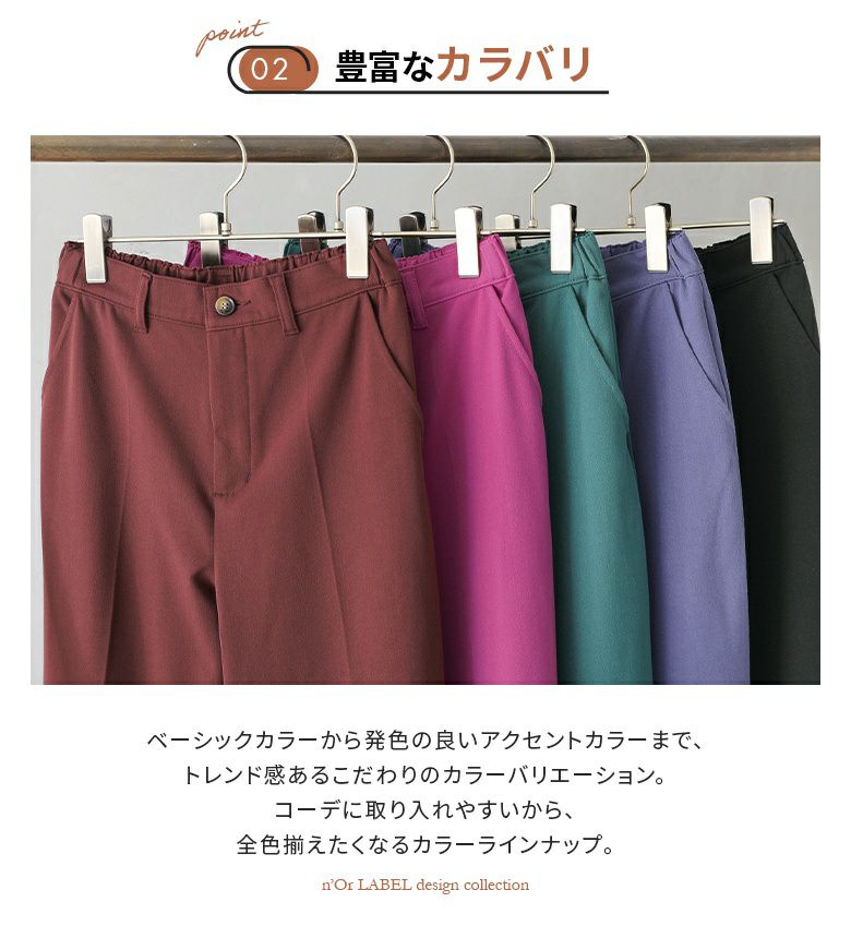 発色の良いカラーパンツは、穿くだけでコーデにトレンド感をプラスしてくれる。美脚効果のあるセンタープレス&ウエストゴム仕様で、キレイもリラックスした穿き心地も叶えます。