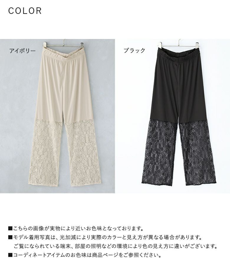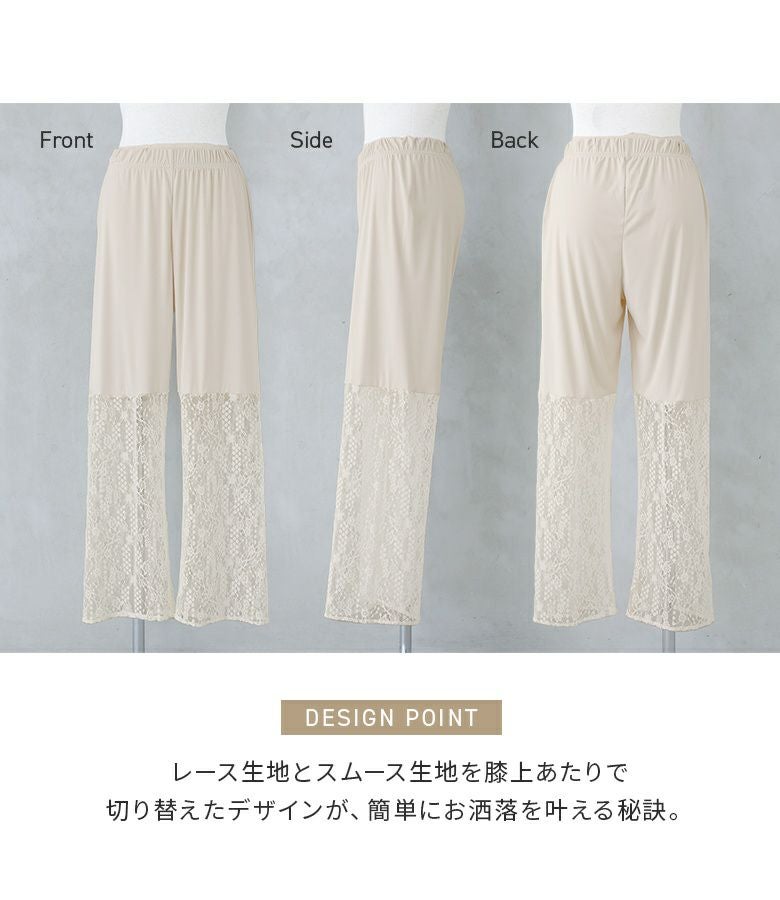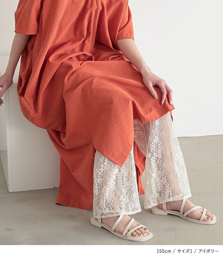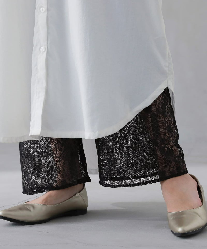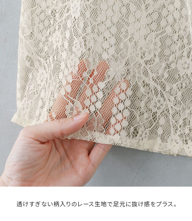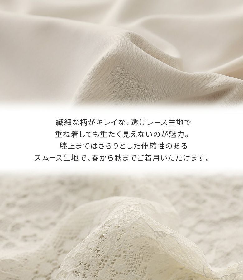 透けすぎない繊細な柄のレース生地は重ね着しても重たく見えないところが魅力。膝上まではさらりとした伸縮性のあるスムース生地でロングシーズン着用いただけます。