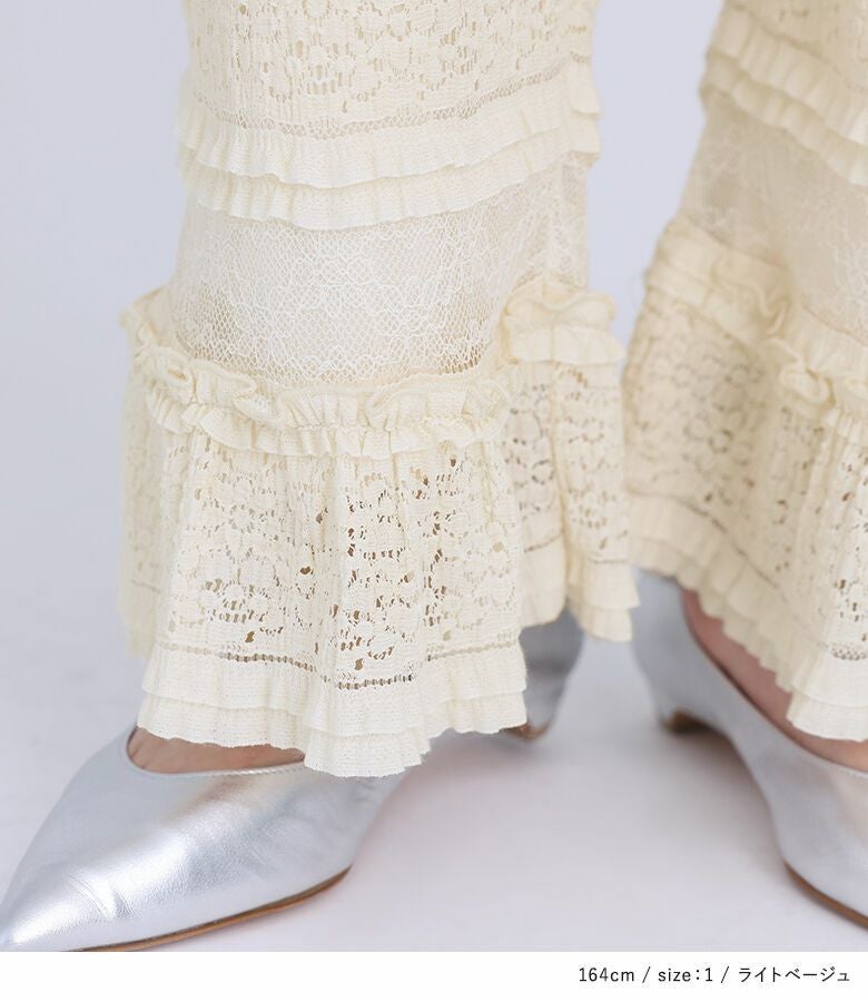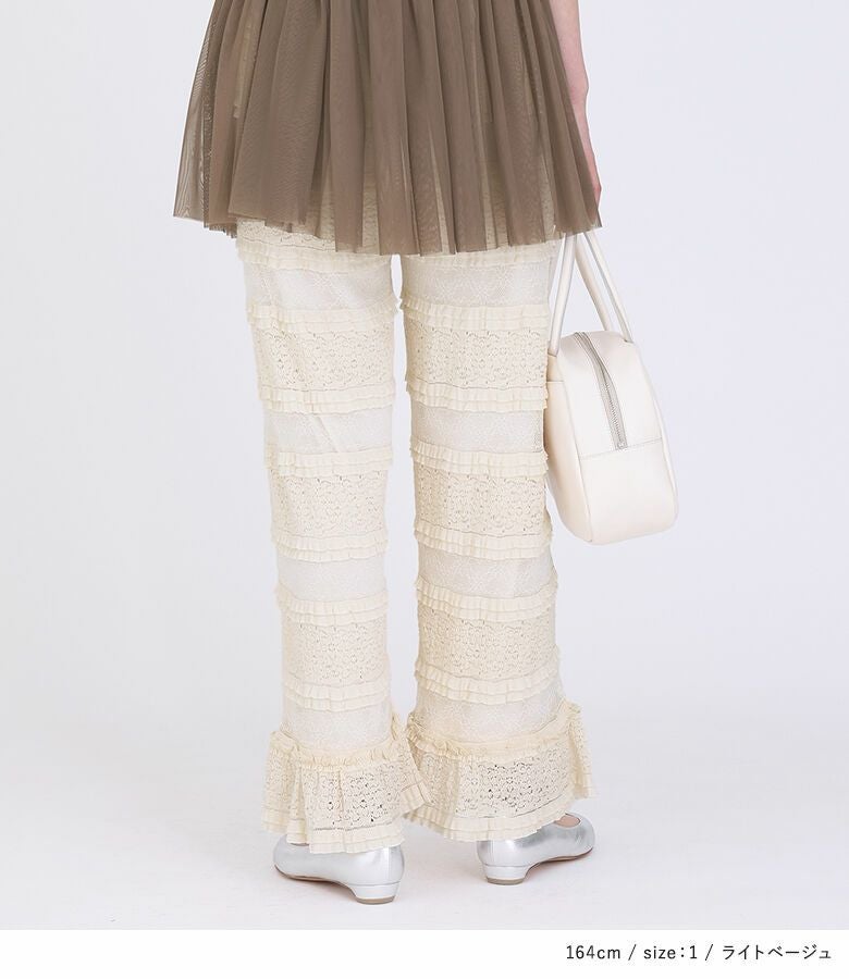 フリルと総レースの生地が華やかなイージーパンツ。裾の切り替えフリルがポイントになったデザイン。ストレートシルエットですっきりとご着用いただけます。ウエストは総ゴムで快適な穿き心地です。