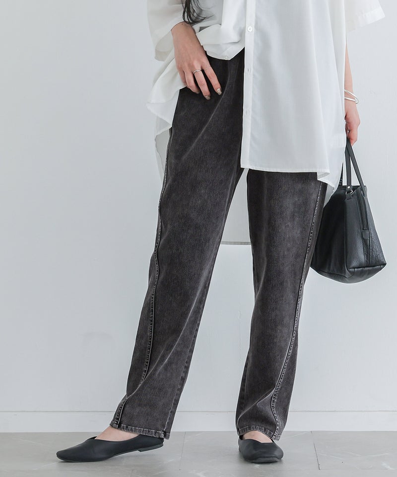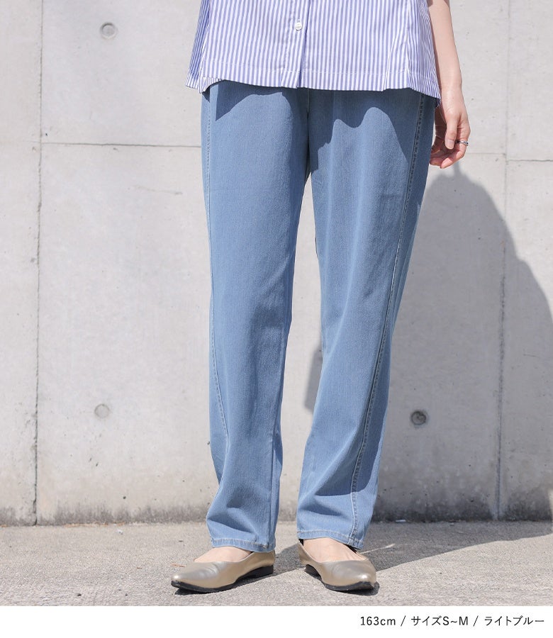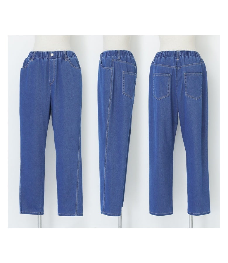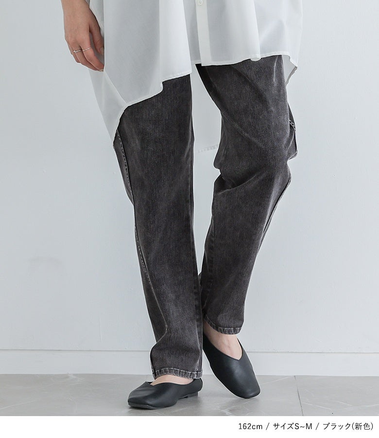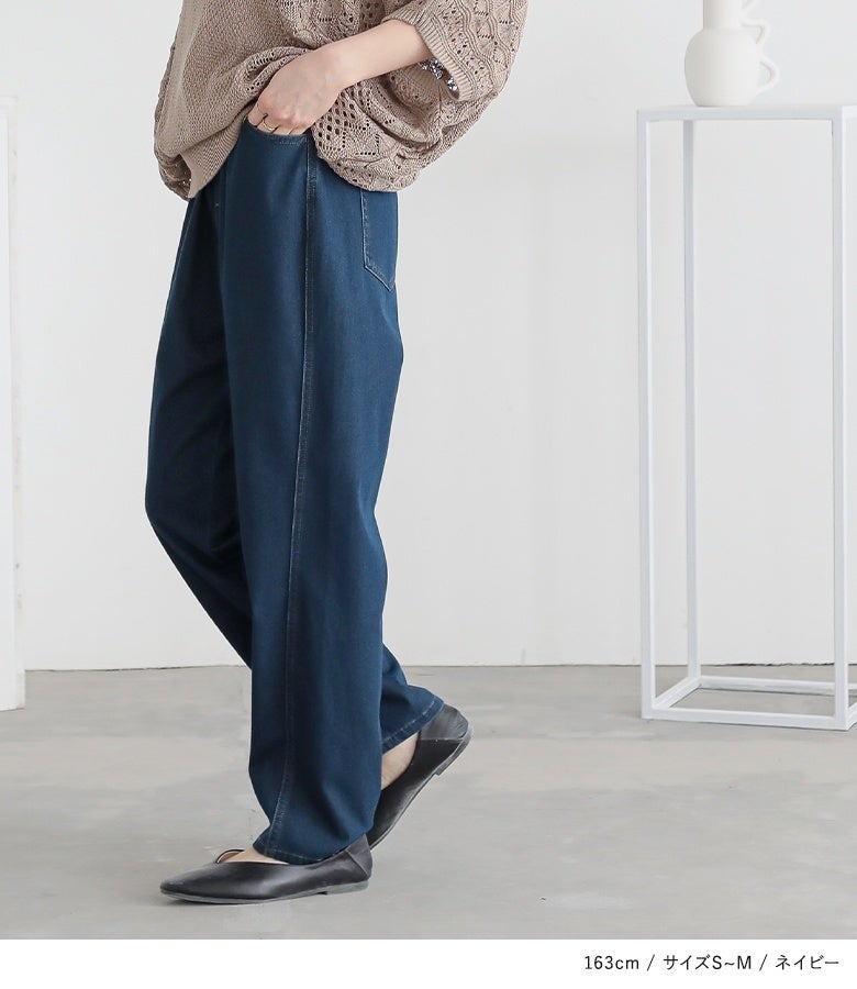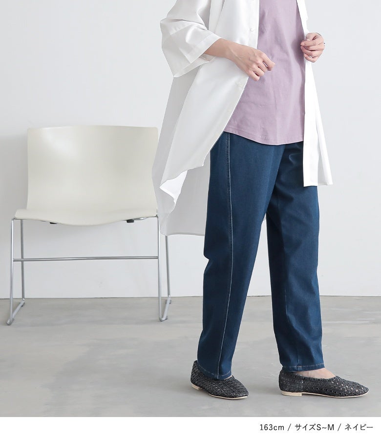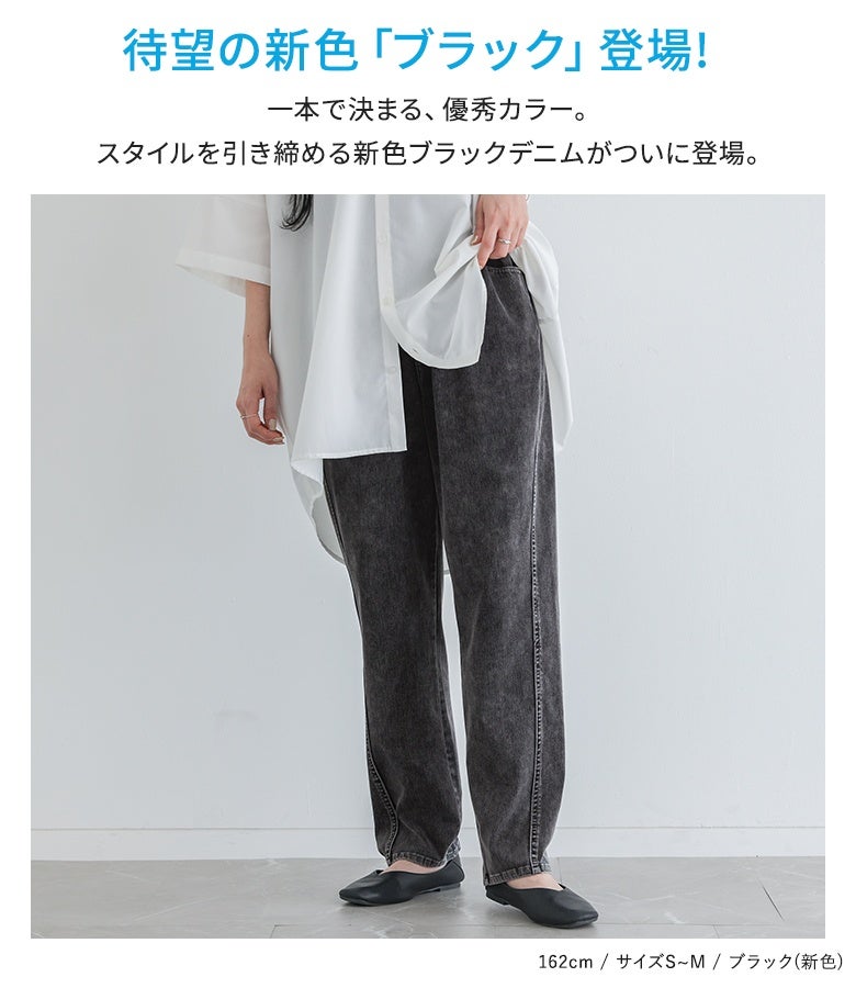 選べる3サイズ展開!キラクに着て楽なジャージーデニムのテーパードパンツ。