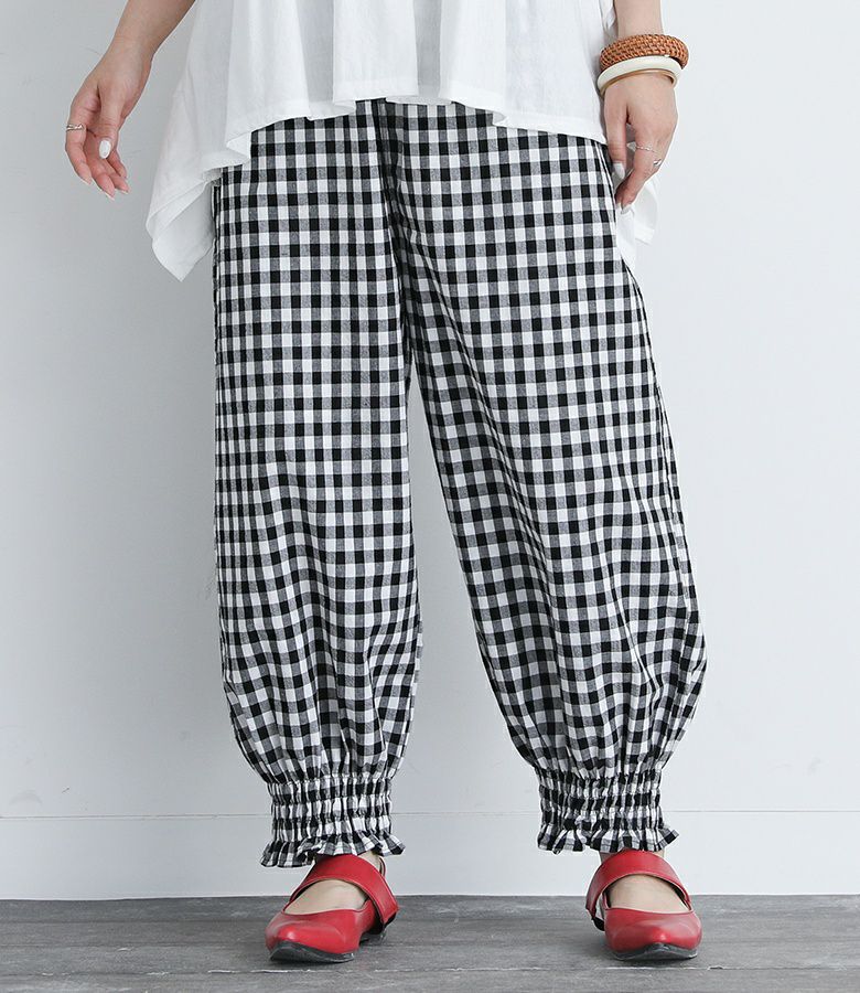 裾口にスモッキング刺を施したギンガムチェックパンツ。