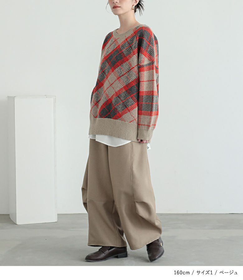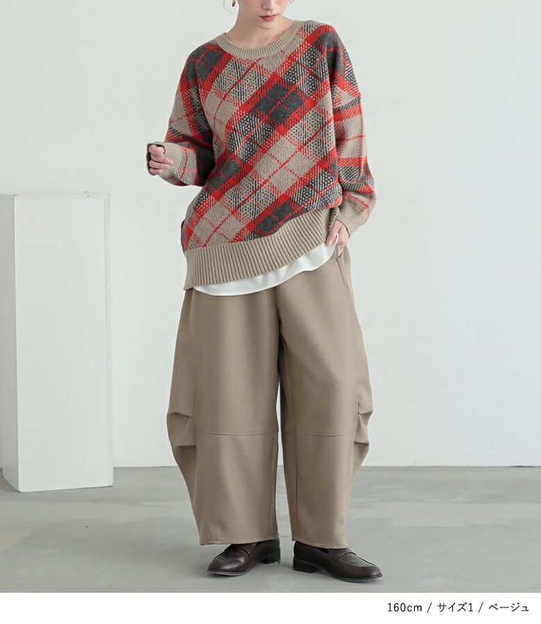 【普段着用】 Tops: L/LL Bottoms:LL | 【1】 着丈(ウエスト穿き):くるぶしが見える位 ウエスト:やや窮屈 ヒップ:ややゆったり 太もも周り:ゆったり 全体:ややゆったり
