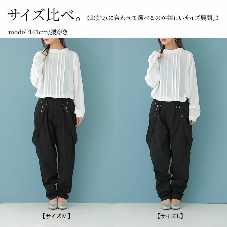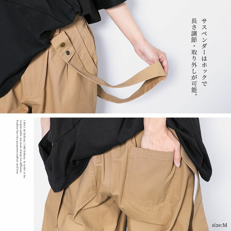 M・Lの2サイズ展開に加えて、サスペンダーはスナップボタンで長さ調整や取り外しが簡単にできるのも嬉しいポイント♪