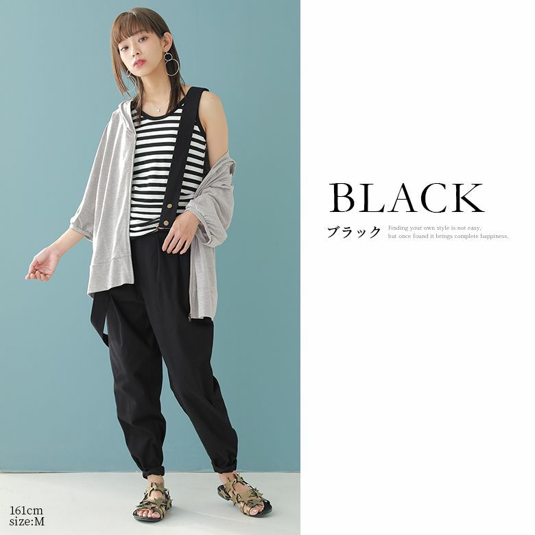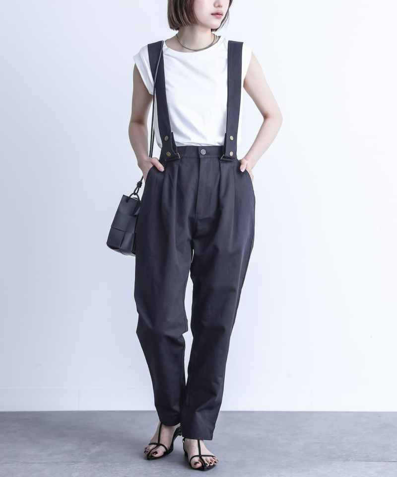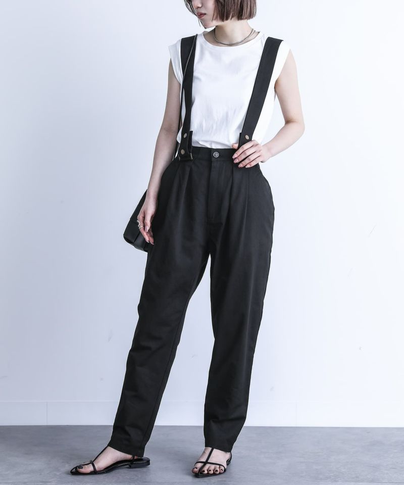 少しモードな雰囲気を漂わせるサスペンダー付きパンツ。
