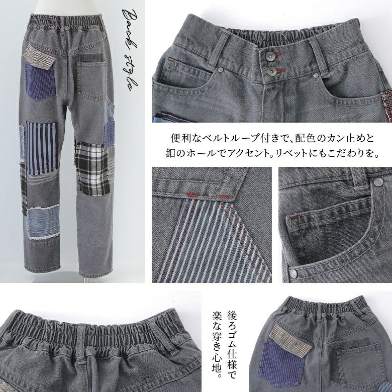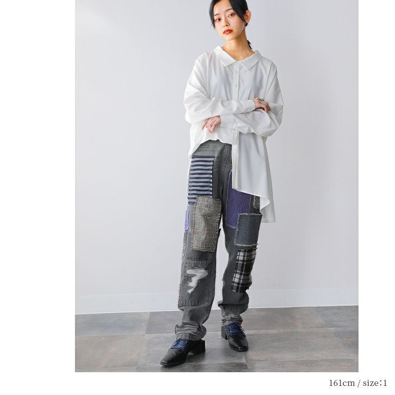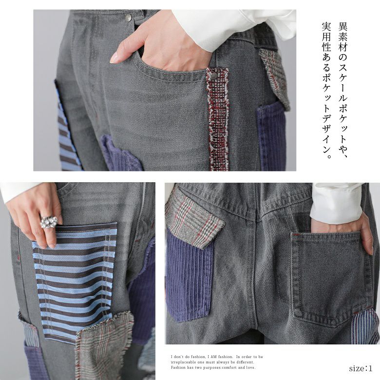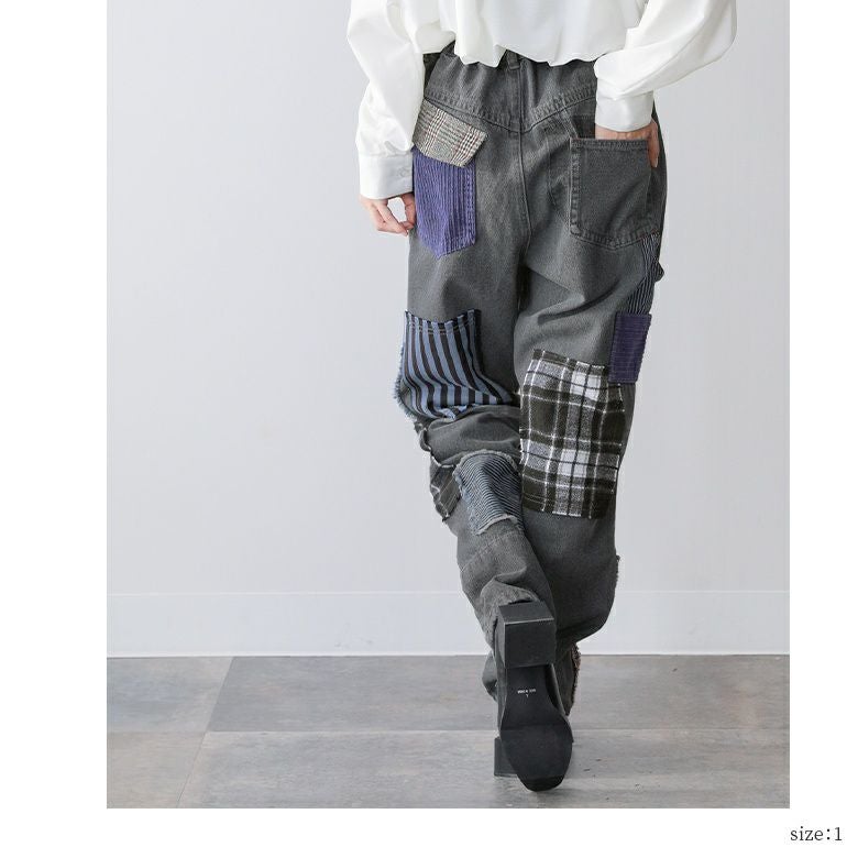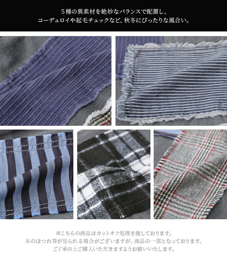 ヴィンテージ感のある5種の異素材を絶妙なバランスで配置したパッチワークデザイン。コットン100%のデニム生地&季節感のある異素材の風合いがここにしかない特別感を放ちます。