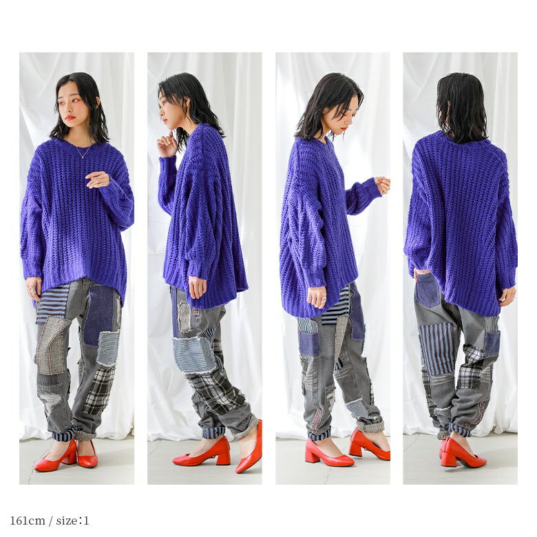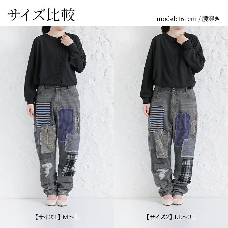 1(M~L)はウエストがタイトで窮屈感がありますが、股から下はゆるっとしたシルエットで穿けました。2(LL~3L)は丈が長めなのでロールアップを2回してちょうど良い感じで穿けました。私の場合は、ルーズなシルエットで可愛く穿けた2(LL~3L)を選びます。