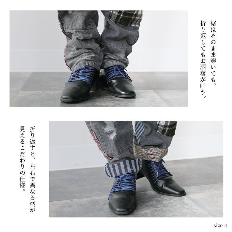 裾がクシュっとなるシルエットは、そのまま穿いてもロールアップして左右異なる柄を覗かせてもお洒落に決まる。