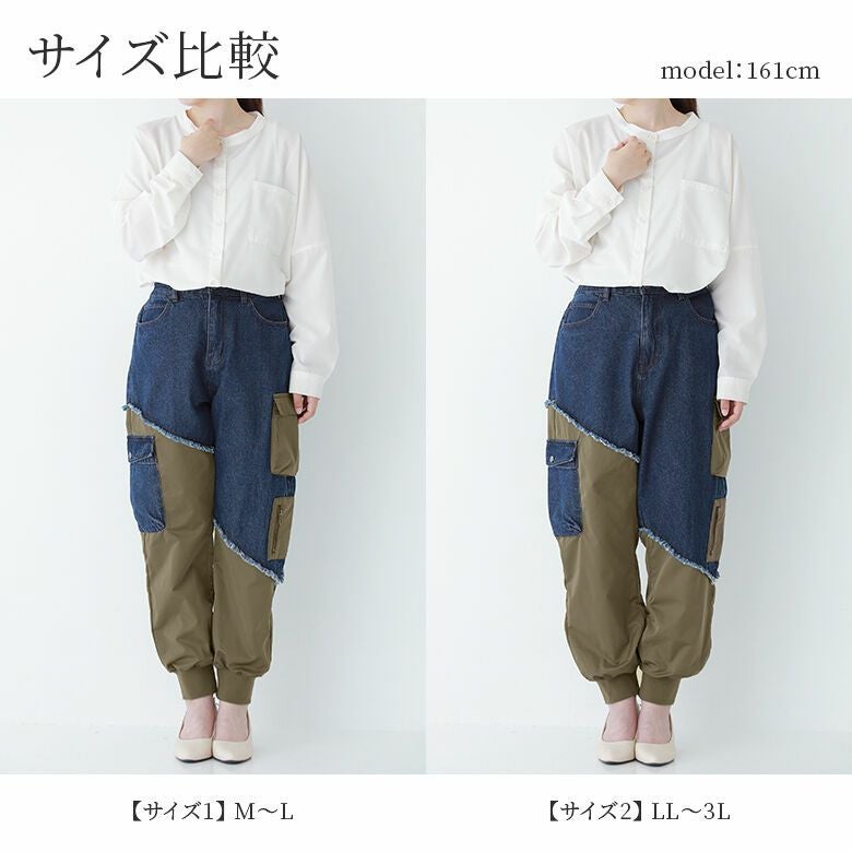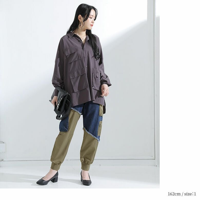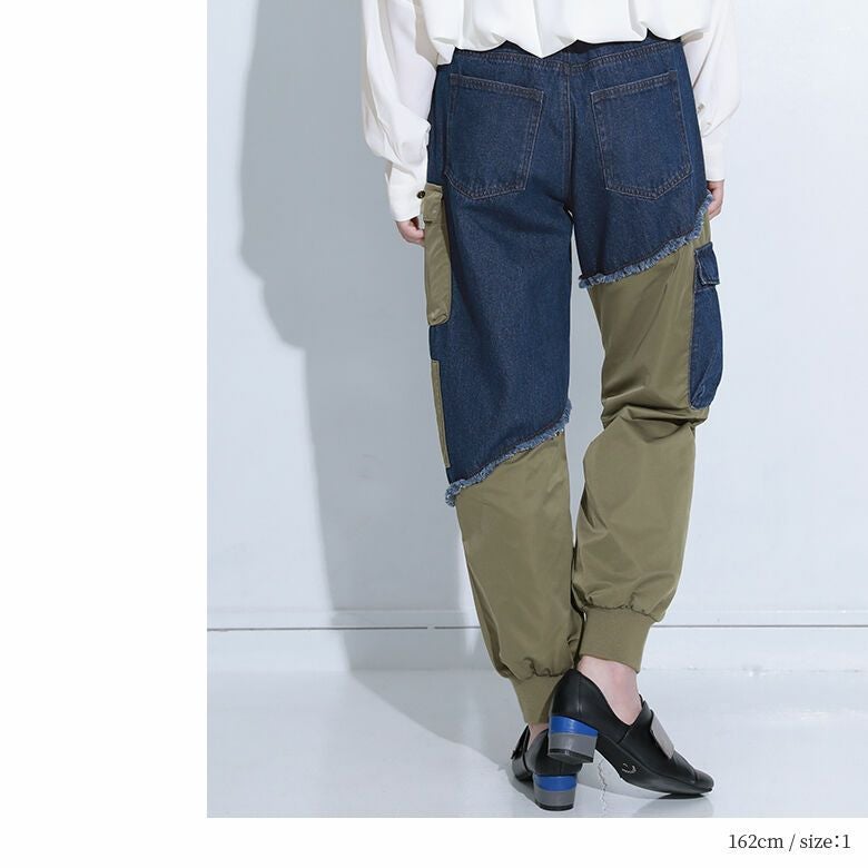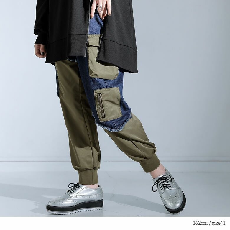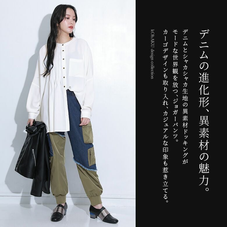 デニムとシャカシャカ生地の異素材ドッキングがモードな世界観を放つ、ジョガーパンツ。カーゴデザインも取り入れ、カジュアルな印象も惹き立てる。