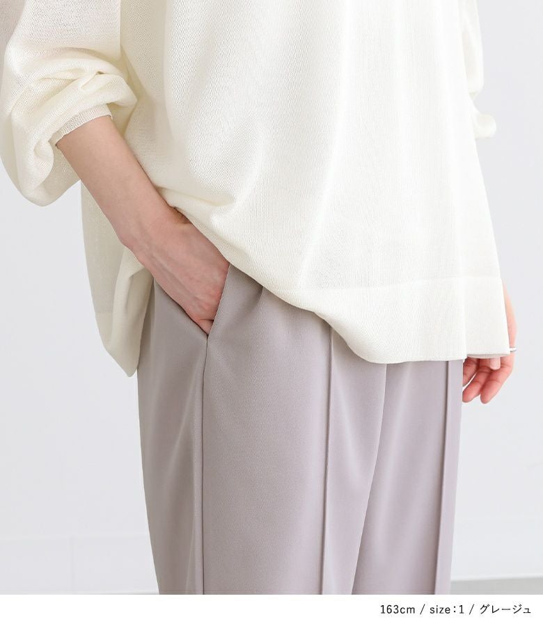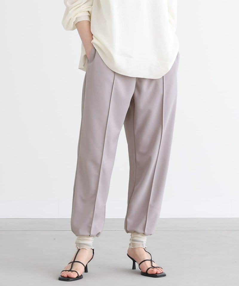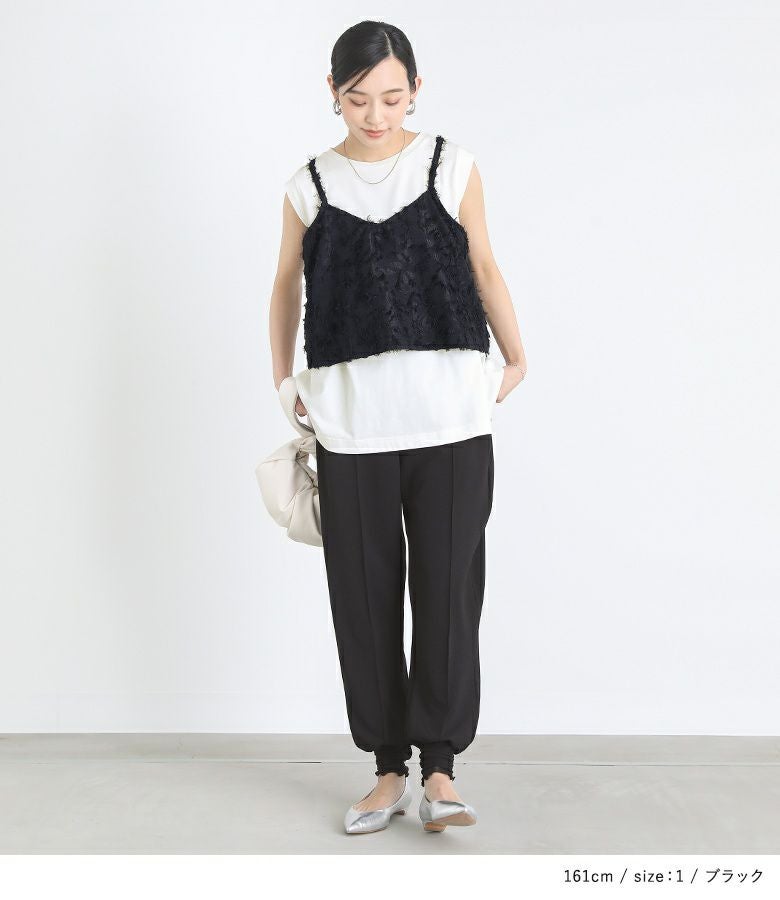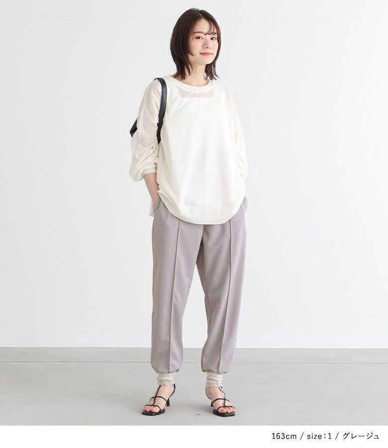 裾のメッシュの切り替えがポイントになったジョガーパンツ。裾の部分はくしゅくしゅとさせても、脚の甲まで覆ってトレンカ風にしてもお洒落な一枚。ピンタックステッチで脚長効果も◎